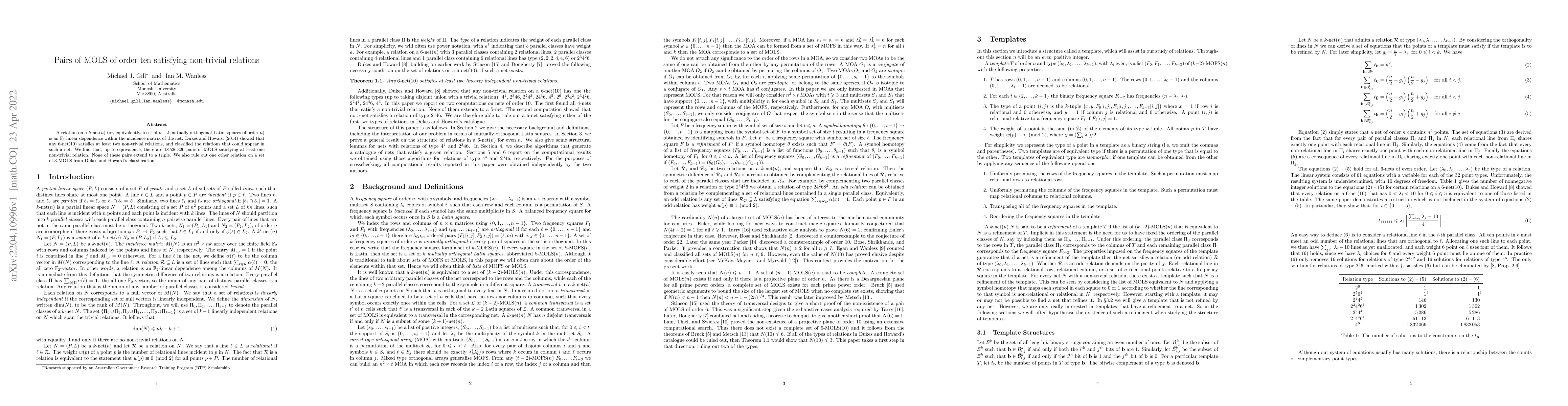 This paper identifies $18,526,320$ pairs of mutually orthogonal Latin squares (MOLS) of order ten that satisfy at least one non-trivial relation, and demonstrates that none of these pairs can form a triple of MOLS. Additionally, it refutes the possibility of one specific relation on a set of three MOLS previously classified by Dukes and Howard (2014).