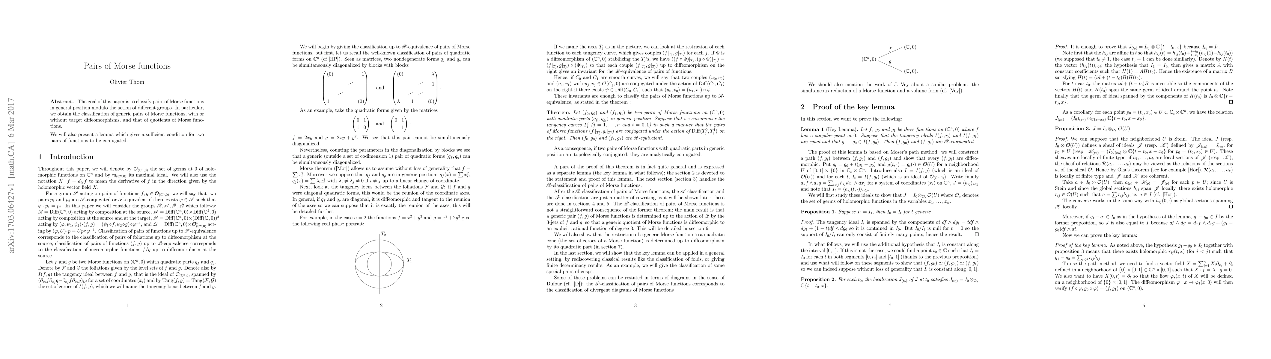 This paper classifies pairs of Morse functions in general position, considering their equivalence under various group actions. It provides a sufficient condition for conjugacy between such pairs and explores quotients of Morse functions.