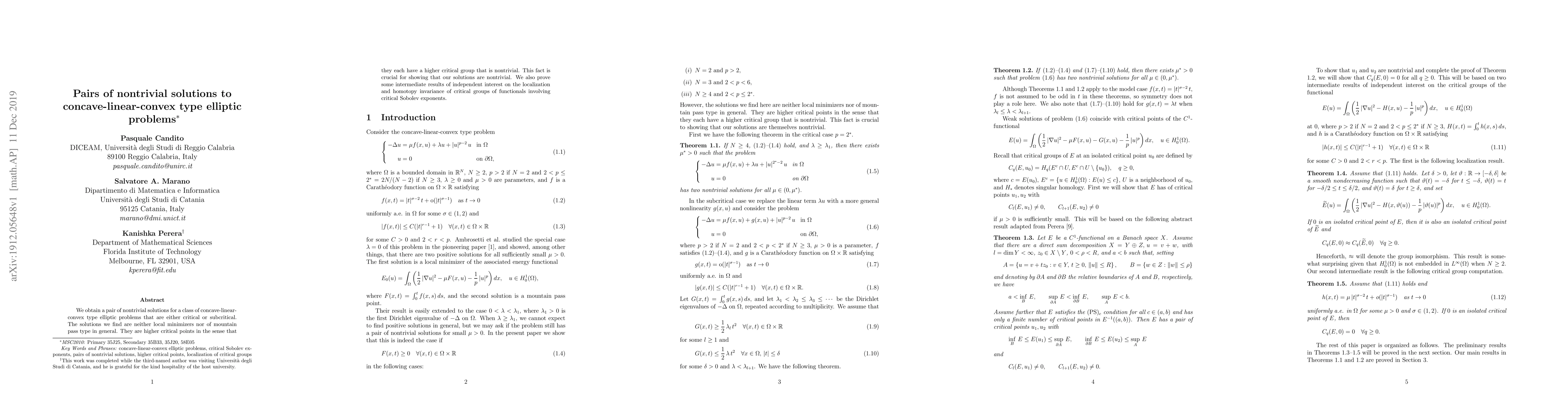This paper finds a pair of nontrivial solutions to concave-linear-convex type elliptic problems, demonstrating they are higher critical points with nontrivial critical groups. It also proves intermediate results on the localization and homotopy invariance of critical groups at critical Sobolev exponents.