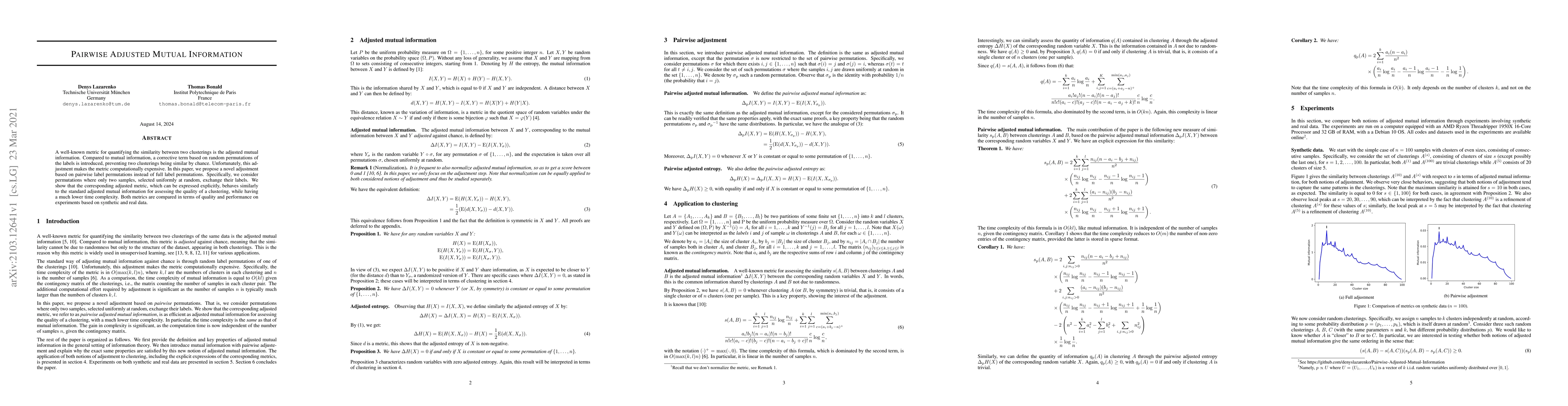 This paper proposes a novel pairwise adjusted mutual information (PAMI) metric that reduces computational expense while maintaining similar performance to the standard adjusted mutual information. The PAMI method uses pairwise label permutations instead of full permutations, significantly lowering time complexity, and is validated through experiments on both synthetic and real data.