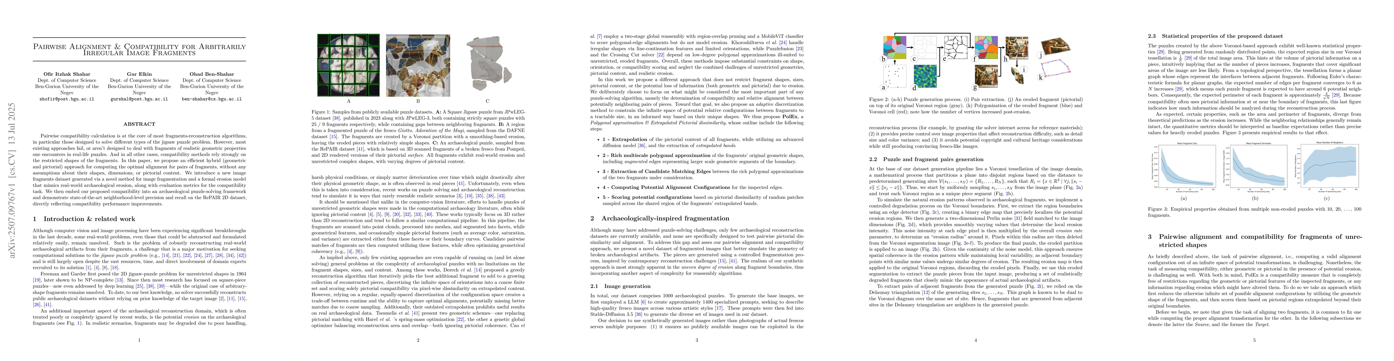 Pairwise compatibility calculation is at the core of most fragments-reconstruction algorithms, in particular those designed to solve different types of the jigsaw puzzle problem. However, most existing approaches fail, or aren't designed to deal with fragments of realistic geometric properties one encounters in real-life puzzles. And in all other cases, compatibility methods rely strongly on the restricted shapes of the fragments. In this paper, we propose an efficient hybrid (geometric and pictorial) approach for computing the optimal alignment for pairs of fragments, without any assumptions about their shapes, dimensions, or pictorial content. We introduce a new image fragments dataset generated via a novel method for image fragmentation and a formal erosion model that mimics real-world archaeological erosion, along with evaluation metrics for the compatibility task. We then embed our proposed compatibility into an archaeological puzzle-solving framework and demonstrate state-of-the-art neighborhood-level precision and recall on the RePAIR 2D dataset, directly reflecting compatibility performance improvements.