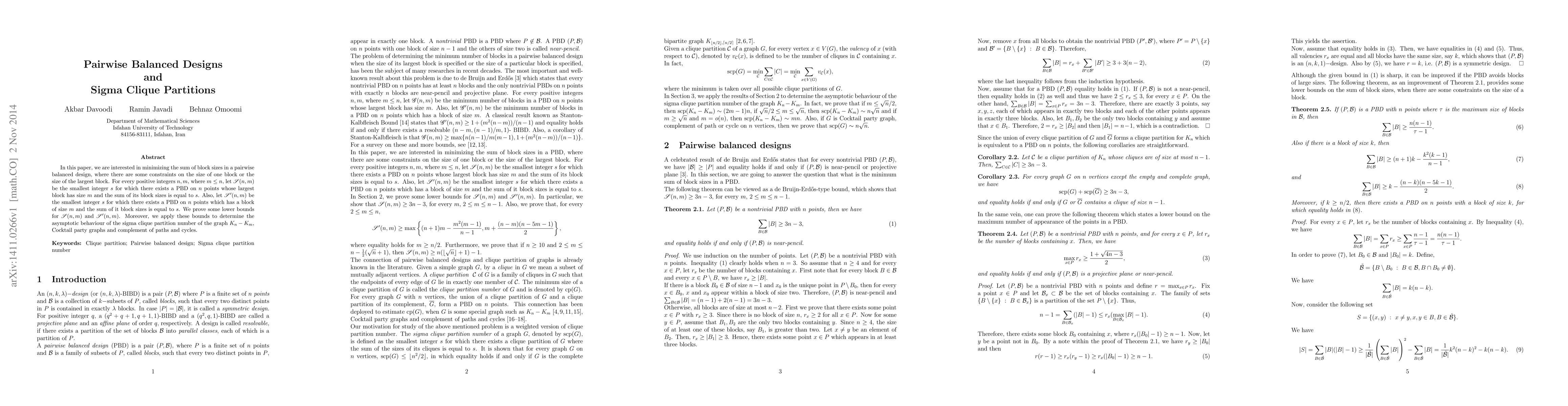 This paper investigates minimizing the sum of block sizes in pairwise balanced designs (PBDs) under constraints on block sizes. It establishes lower bounds for the smallest integers associated with PBDs and applies these bounds to analyze the asymptotic behavior of sigma clique partitions in specific graph structures.