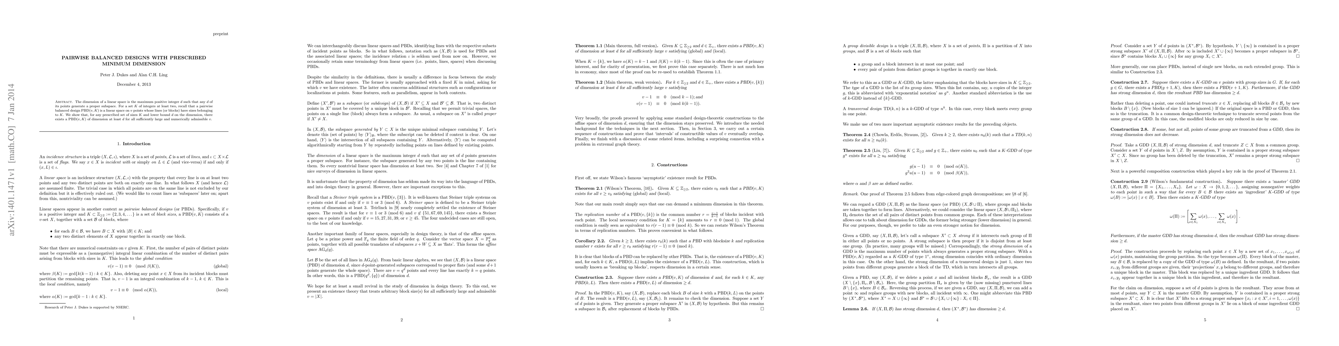 This paper demonstrates the existence of pairwise balanced designs (PBD) with specified dimensions for sufficiently large and admissible point counts, given a set of line sizes and a minimum dimension requirement. The authors prove that such designs can be constructed for any sufficiently large $v$ when the prescribed conditions are met.