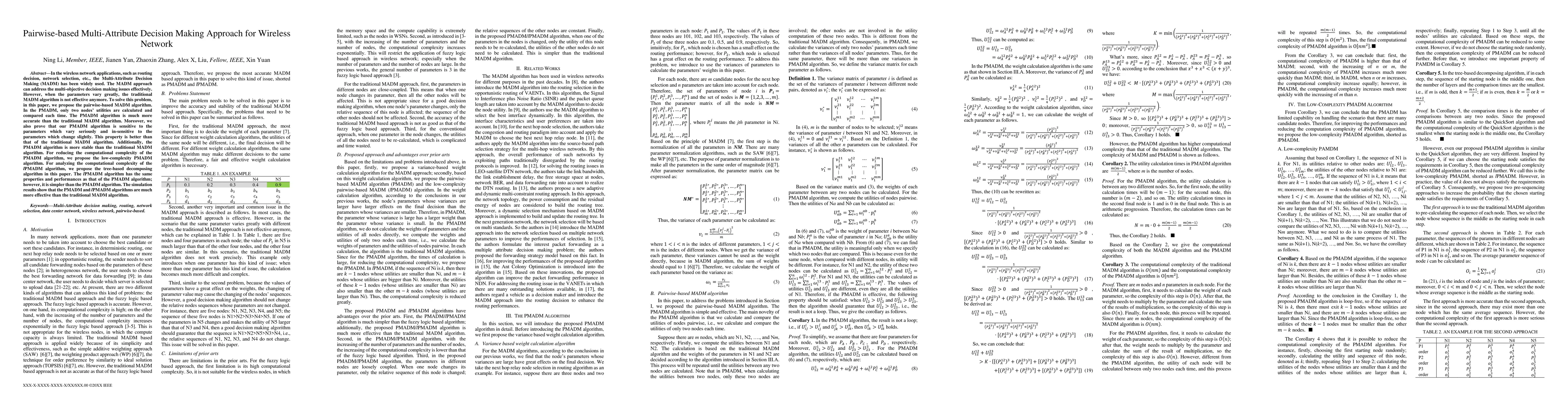 In the wireless network applications, such as routing decision, network selection, etc., the Multi-Attribute Decision Making (MADM) has been widely used. The MADM approach can address the multi-objective decision making issues effectively.However, when the parameters vary greatly, the traditionalMADM algorithm is not effective anymore. To solve this problem,in this paper, we propose the pairwise-based MADM algorithm.In the PMADM, only two nodes utilities are calculated and compared each time. The PMADM algorithm is much more accurate than the traditional MADM algorithm. Moreover, we also prove that our PMADM algorithm is sensitive to the parameters which vary seriously and in-sensitive to the parameters which change slightly. This property is better than that of the traditional MADM algorithm. Additionally, the PMADM algorithm is more stable than the traditional MADM algorithm. For reducing the computational complexity of the PMADM algorithm, we propose the low-complexity PMADM algorithm. For analyzing the computational complexity of the lPMADM algorithm, we propose the tree-based decomposing algorithm in this paper. The lPMADM algorithm has the same properties and performances as that of the PMADM algorithm; however, it is simpler than the PMADM algorithm. The simulation results show that the PMADM and lPMADM algorithms are much more effective than the traditional MADM algorithm.