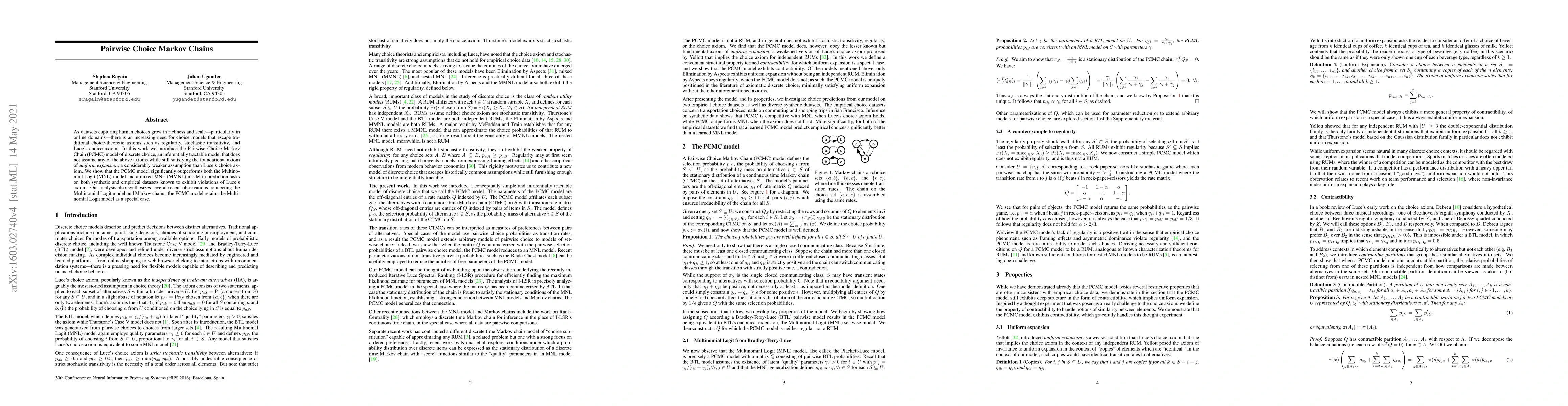 The Pairwise Choice Markov Chain (PCMC) model offers a flexible alternative to traditional choice models by not assuming axioms like regularity and stochastic transitivity, while still adhering to uniform expansion. The PCMC model outperforms the Multinomial Logit model in predictive tasks on datasets that violate Luce's axiom, and it encompasses the Multinomial Logit model as a special case.