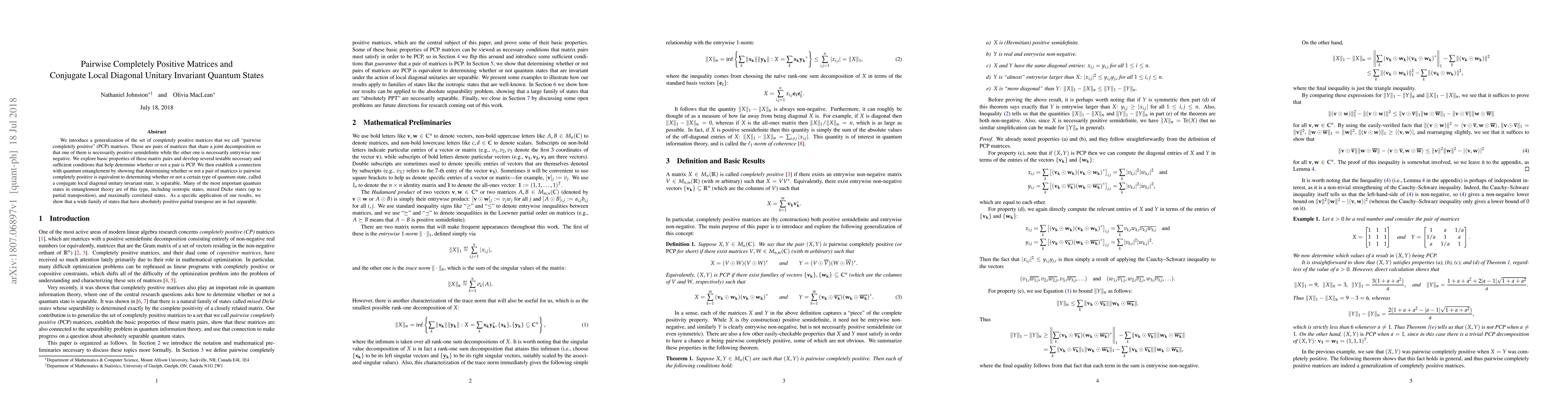 This research introduces 'pairwise completely positive' (PCP) matrices, pairs with specific joint decomposition properties. It links PCP matrices to quantum entanglement, showing their equivalence in determining separability of 'conjugate local diagonal unitary invariant states'. The study provides conditions for identifying PCP pairs and reveals that numerous significant quantum states are of this type, including isotropic, mixed Dicke, and maximally correlated states. It also demonstrates that many states with positive partial transposes are separable.