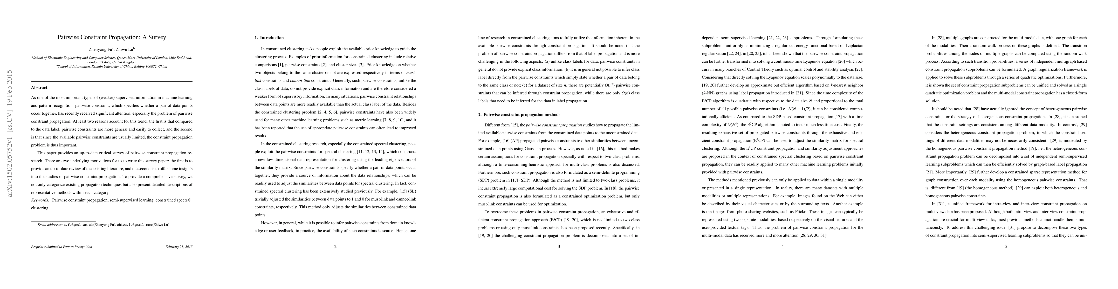 This survey paper categorizes existing pairwise constraint propagation techniques and provides detailed descriptions of representative methods within each category.