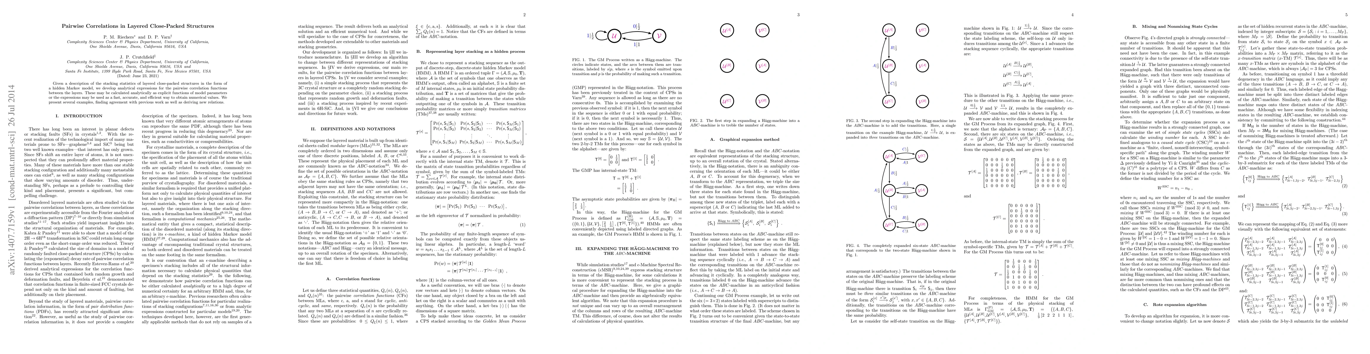 Given a description of the stacking statistics of layered close-packed structures in the form of a hidden Markov model, we develop analytical expressions for the pairwise correlation functions between the layers. These may be calculated analytically as explicit functions of model parameters or the expressions may be used as a fast, accurate, and efficient way to obtain numerical values. We present several examples, finding agreement with previous work as well as deriving new relations.
