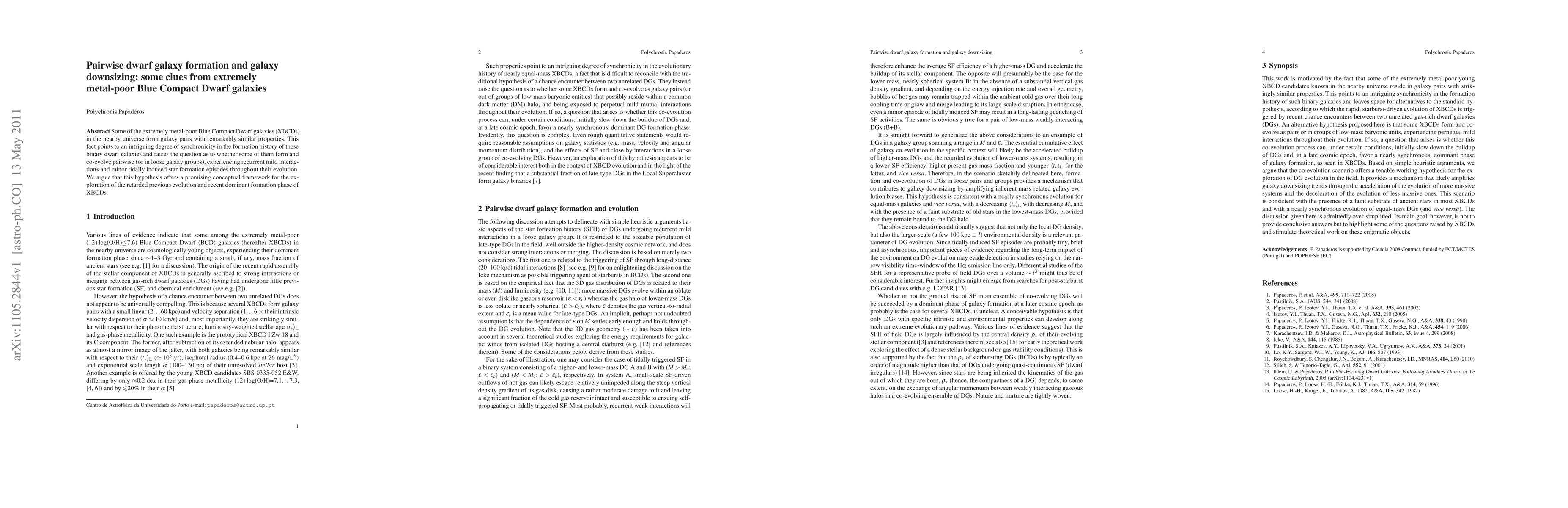 This paper explores the formation and co-evolution of extremely metal-poor Blue Compact Dwarf galaxies (XBCDs) that form pairs with similar properties, suggesting they may co-evolve through recurrent mild interactions and minor star formation episodes. This pairwise formation hypothesis provides insight into the delayed previous evolution and recent dominant formation phase of XBCDs.