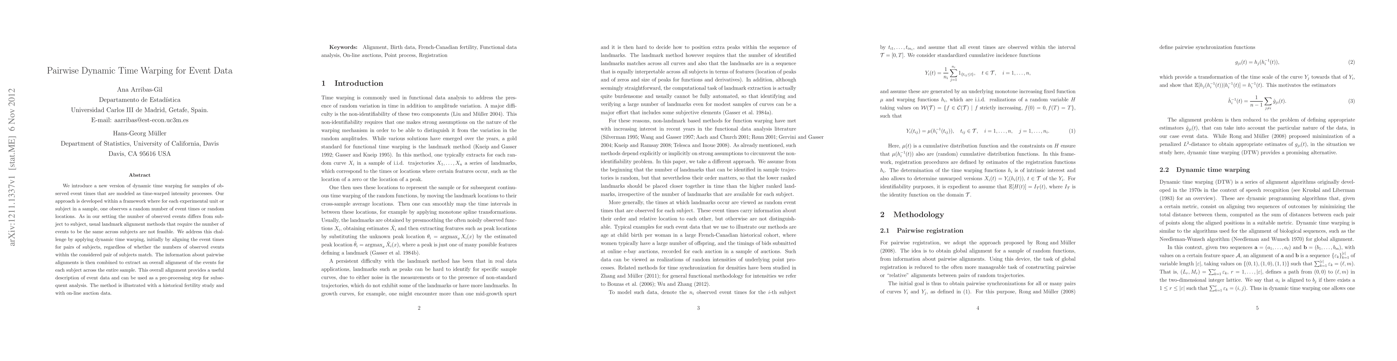 We introduce a new version of dynamic time warping for samples of observed event times that are modeled as time-warped intensity processes. Our approach is devel- oped within a framework where for each experimental unit or subject in a sample, one observes a random number of event times or random locations. As in our setting the number of observed events differs from subject to subject, usual landmark align- ment methods that require the number of events to be the same across subjects are not feasible. We address this challenge by applying dynamic time warping, initially by aligning the event times for pairs of subjects, regardless of whether the numbers of observed events within the considered pair of subjects match. The information about pairwise alignments is then combined to extract an overall alignment of the events for each subject across the entire sample. This overall alignment provides a useful description of event data and can be used as a pre-processing step for subse- quent analysis. The method is illustrated with a historical fertility study and with on-line auction data.