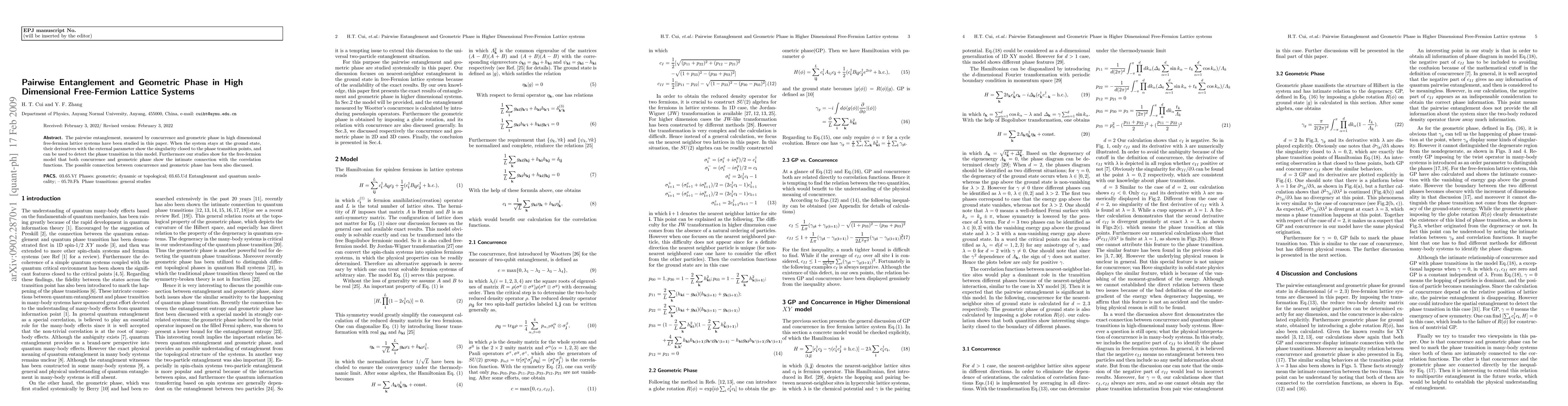 This paper investigates the pairwise entanglement and geometric phase in 2D and 3D free-fermion lattice systems, revealing singularities near phase transition points. The study finds that both concurrence and geometric phase are closely related to correlation functions, suggesting a potential link between them.