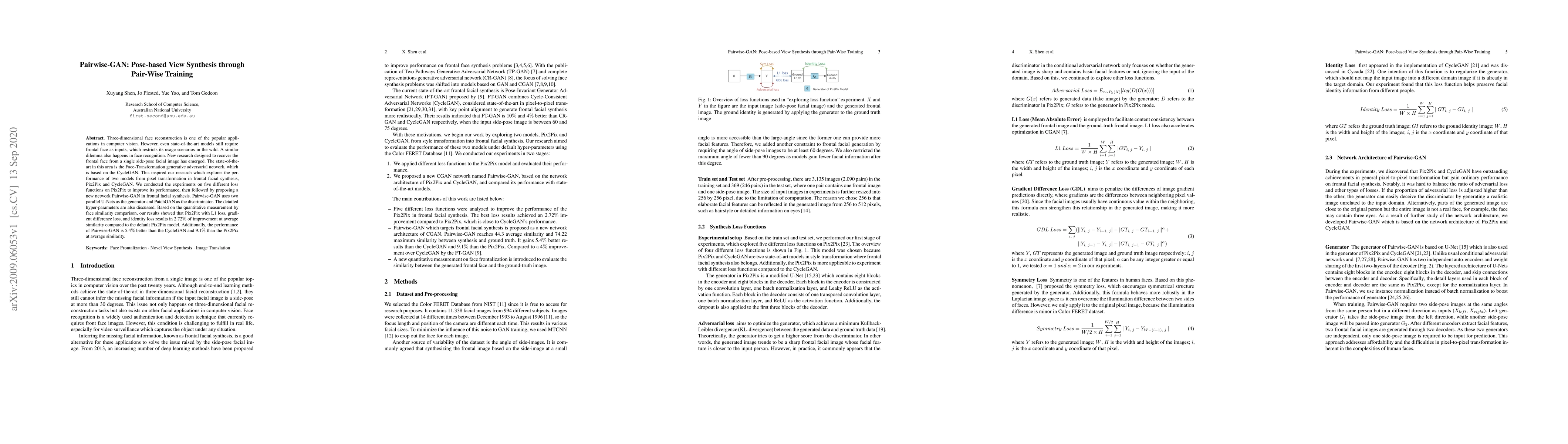 Three-dimensional face reconstruction is one of the popular applications in computer vision. However, even state-of-the-art models still require frontal face as inputs, which restricts its usage scenarios in the wild. A similar dilemma also happens in face recognition. New research designed to recover the frontal face from a single side-pose facial image has emerged. The state-of-the-art in this area is the Face-Transformation generative adversarial network, which is based on the CycleGAN. This inspired our research which explores the performance of two models from pixel transformation in frontal facial synthesis, Pix2Pix and CycleGAN. We conducted the experiments on five different loss functions on Pix2Pix to improve its performance, then followed by proposing a new network Pairwise-GAN in frontal facial synthesis. Pairwise-GAN uses two parallel U-Nets as the generator and PatchGAN as the discriminator. The detailed hyper-parameters are also discussed. Based on the quantitative measurement by face similarity comparison, our results showed that Pix2Pix with L1 loss, gradient difference loss, and identity loss results in 2.72% of improvement at average similarity compared to the default Pix2Pix model. Additionally, the performance of Pairwise-GAN is 5.4% better than the CycleGAN and 9.1% than the Pix2Pix at average similarity.