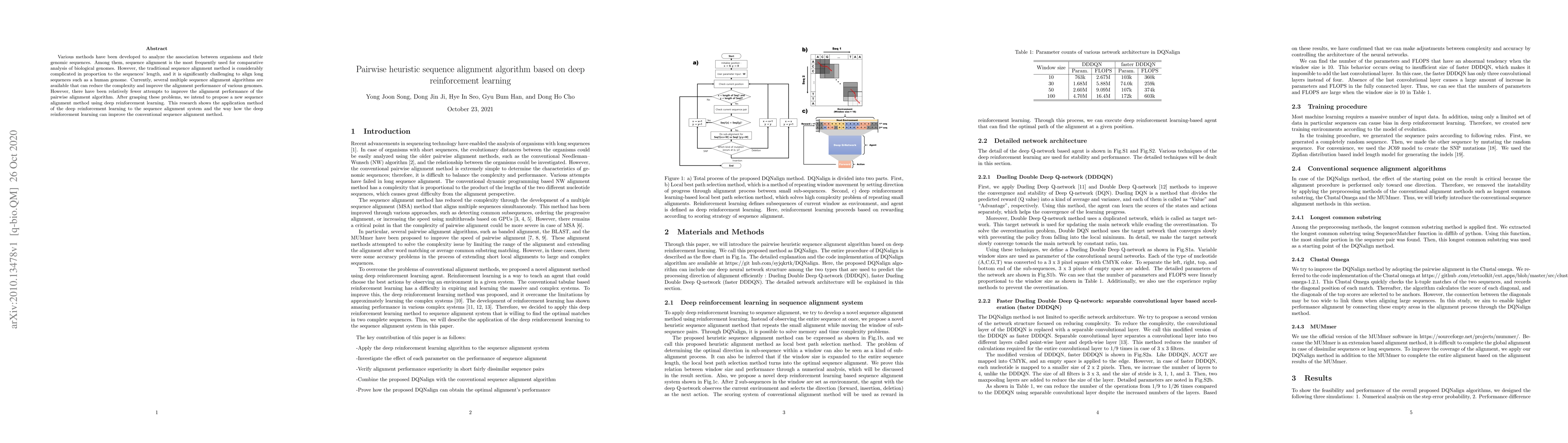 This paper proposes a novel pairwise sequence alignment algorithm based on deep reinforcement learning to improve the efficiency and performance of aligning long genomic sequences, addressing the limitations of traditional methods. The deep reinforcement learning approach enhances the conventional sequence alignment by optimizing the alignment process.