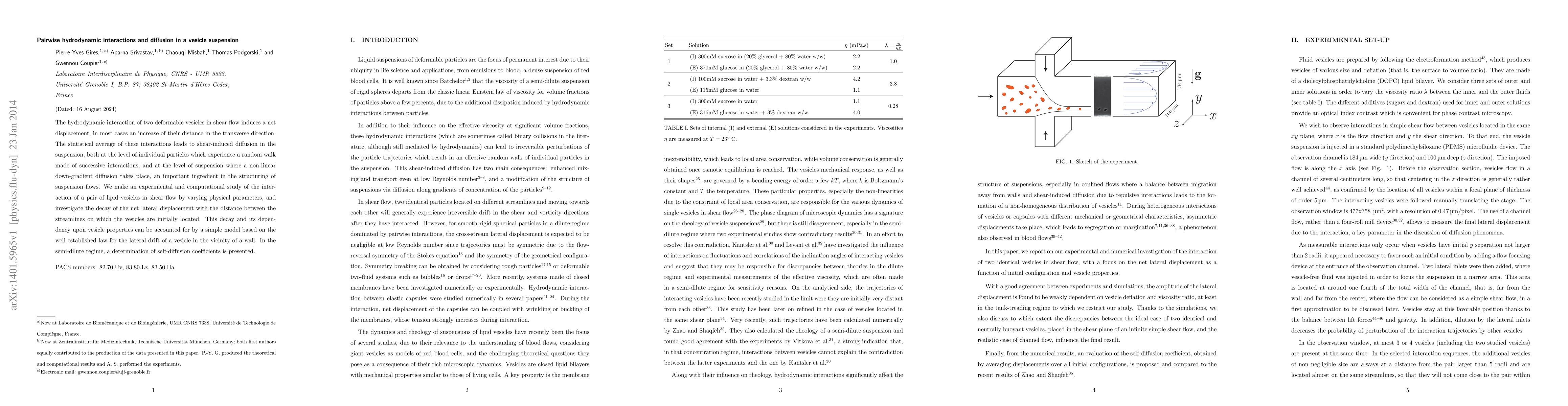 This paper investigates the hydrodynamic interactions between two deformable vesicles in shear flow, focusing on the induced displacement and shear-induced diffusion in vesicle suspensions. Experimental and computational studies reveal a net increase in the transverse distance between vesicles, modeled by a simple law for lateral drift near a wall, and determine self-diffusion coefficients in the semi-dilute regime.