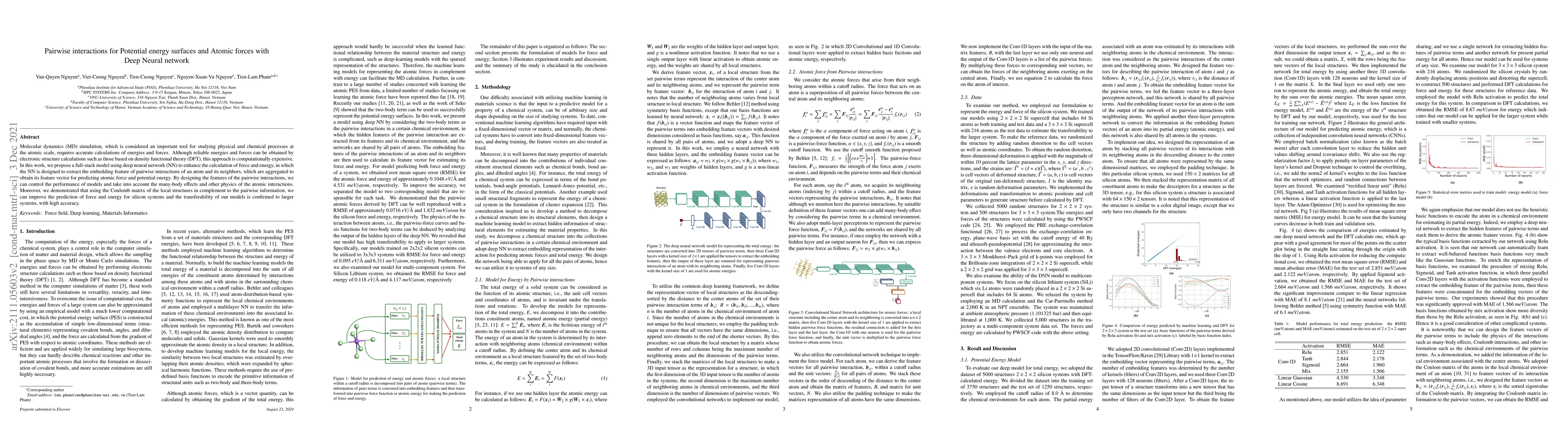 Molecular dynamics (MD) simulation, which is considered an important tool for studying physical and chemical processes at the atomic scale, requires accurate calculations of energies and forces. Although reliable energies and forces can be obtained by electronic structure calculations such as those based on density functional theory (DFT), this approach is computationally expensive. In this work, we propose a full-stack model using deep neural network (NN) to enhance the calculation of force and energy, in which the NN is designed to extract the embedding feature of pairwise interactions of an atom and its neighbors, which are aggregated to obtain its feature vector for predicting atomic force and potential energy. By designing the features of the pairwise interactions, we can control the performance of models and take into account the many-body effects and other physics of the atomic interactions. Moreover, we demonstrated that using the Coulomb matrix of the local structures in complement to the pairwise information, we can improve the prediction of force and energy for silicon systems and the transferability of our models is confirmed to larger systems, with high accuracy.