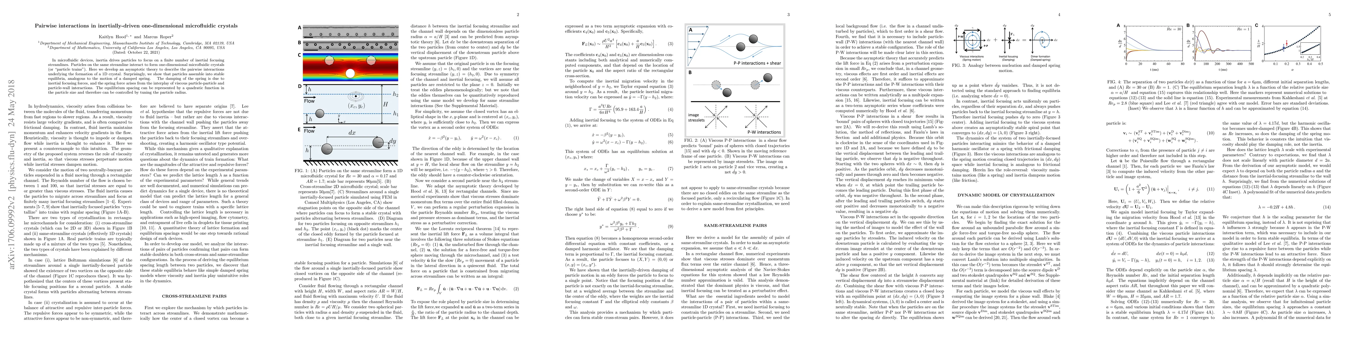This paper develops an asymptotic theory to explain the pairwise interactions forming one-dimensional microfluidic crystals driven by inertial effects. It reveals that particle spacings depend on the distance between the streamline and the nearest channel wall, allowing control over equilibrium spacing by adjusting the particle radius.