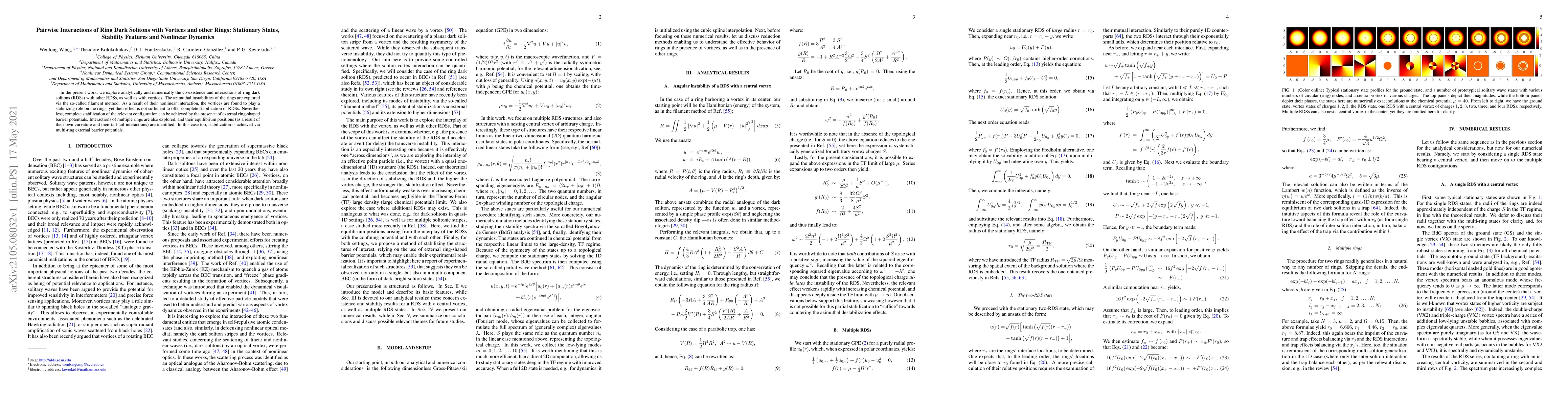 Researchers explored interactions between ring dark solitons and vortices, finding that vortices stabilize rings but not completely, while external barrier potentials achieve stabilization in some cases.