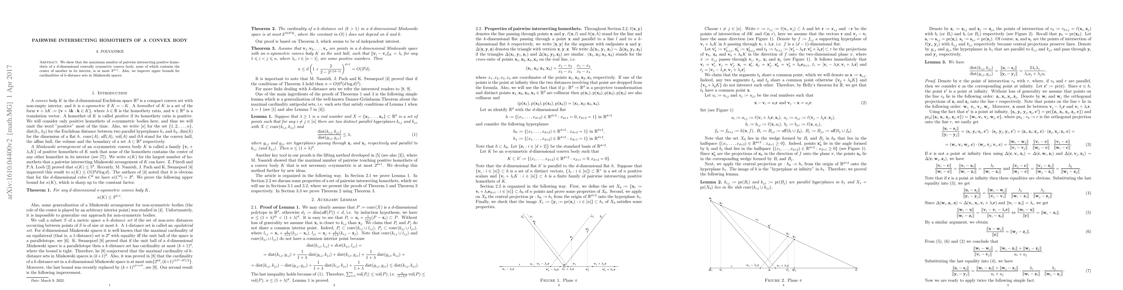 This paper demonstrates that the maximum number of pairwise intersecting homothets of a $d$-dimensional centrally symmetric convex body, where no homothet contains the center of another in its interior, is at most $3^{d+1}$. Additionally, it enhances the upper bounds for the cardinalities of $k$-distance sets in Minkowski spaces.