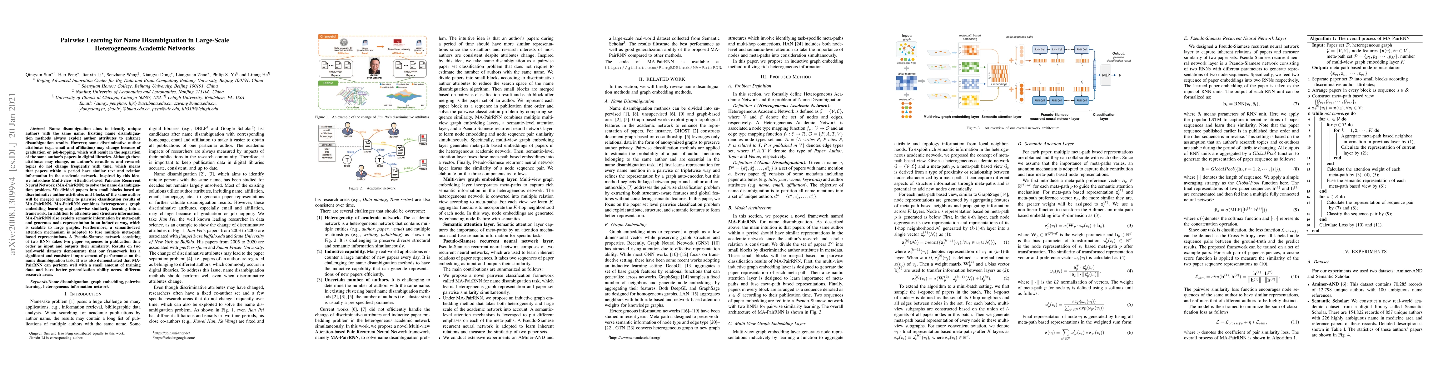 This paper proposes a Multi-view Attention-based Pairwise Recurrent Neural Network (MA-PairRNN) for name disambiguation in large-scale academic networks, leveraging co-authorship and research topics to overcome the limitations of changing author attributes. The framework combines graph embedding, pairwise similarity, and semantic information to generate scalable node representations.