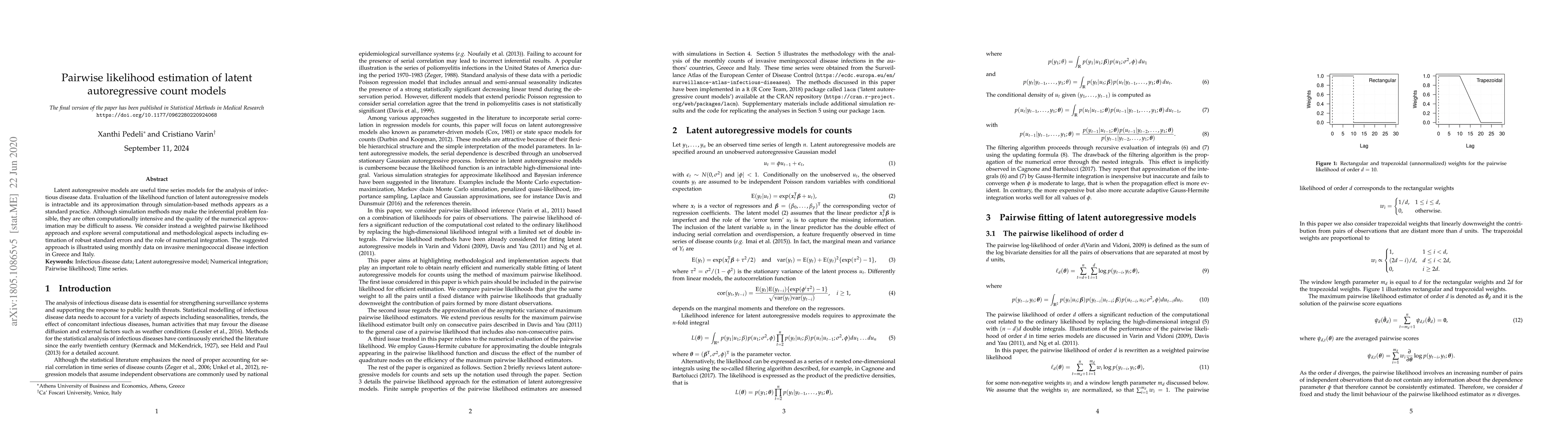 A new method for estimating latent autoregressive count models uses weighted pairwise likelihood, improving efficiency and accuracy over traditional simulation-based methods. This approach is illustrated with data on invasive meningococcal disease in Greece and Italy.