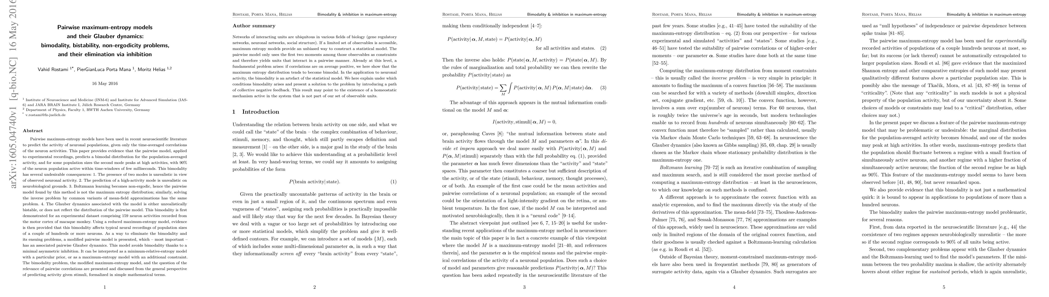 Pairwise maximum-entropy models have been used in recent neuroscientific literature to predict the activity of neuronal populations, given only the time-averaged correlations of the neuron activities. This paper provides evidence that the pairwise model, applied to experimental recordings, predicts a bimodal distribution for the population-averaged activity, and for some population sizes the second mode peaks at high activities, with 90% of the neuron population active within time-windows of few milliseconds. This bimodality has several undesirable consequences: 1. The presence of two modes is unrealistic in view of observed neuronal activity. 2. The prediction of a high-activity mode is unrealistic on neurobiological grounds. 3. Boltzmann learning becomes non-ergodic, hence the pairwise model found by this method is not the maximum entropy distribution; similarly, solving the inverse problem by common variants of mean-field approximations has the same problem. 4. The Glauber dynamics associated with the model is either unrealistically bistable, or does not reflect the distribution of the pairwise model. This bimodality is first demonstrated for an experimental dataset comprising 159 neuron activities recorded from the motor cortex of macaque monkey. Using a reduced maximum-entropy model, evidence is then provided that this bimodality affects typical neural recordings of population sizes of a couple of hundreds or more neurons. As a way to eliminate the bimodality and its ensuing problems, a modified pairwise model is presented, which -- most important -- has an associated pairwise Glauber dynamics. This model avoids bimodality thanks to a minimal asymmetric inhibition. It can be interpreted as a minimum-relative-entropy model with a particular prior, or as a maximum-entropy model with an additional constraint.