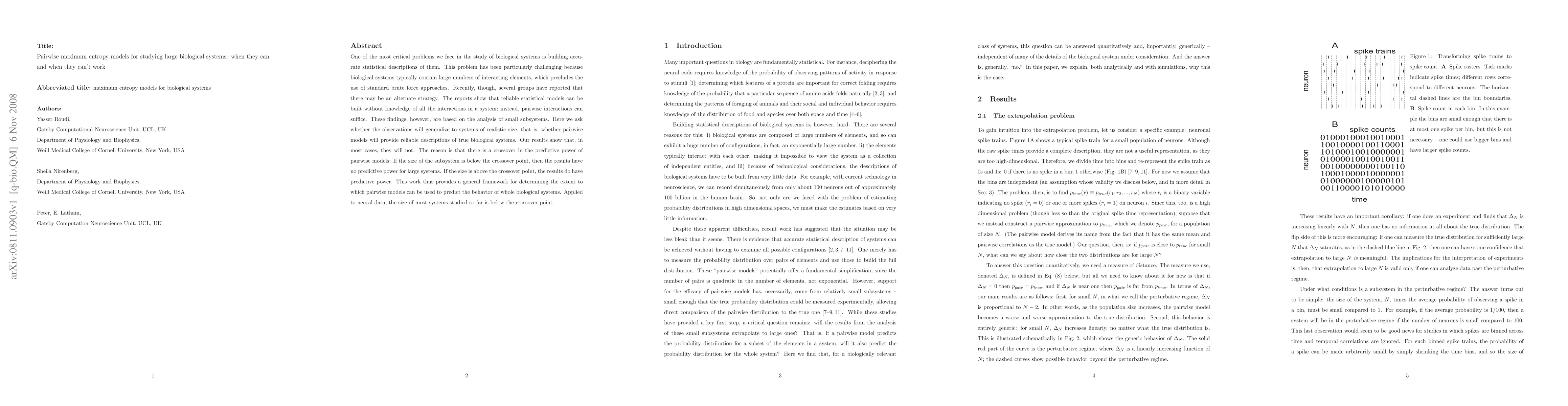 One of the most critical problems we face in the study of biological systems is building accurate statistical descriptions of them. This problem has been particularly challenging because biological systems typically contain large numbers of interacting elements, which precludes the use of standard brute force approaches. Recently, though, several groups have reported that there may be an alternate strategy. The reports show that reliable statistical models can be built without knowledge of all the interactions in a system; instead, pairwise interactions can suffice. These findings, however, are based on the analysis of small subsystems. Here we ask whether the observations will generalize to systems of realistic size, that is, whether pairwise models will provide reliable descriptions of true biological systems. Our results show that, in most cases, they will not. The reason is that there is a crossover in the predictive power of pairwise models: If the size of the subsystem is below the crossover point, then the results have no predictive power for large systems. If the size is above the crossover point, the results do have predictive power. This work thus provides a general framework for determining the extent to which pairwise models can be used to predict the behavior of whole biological systems. Applied to neural data, the size of most systems studied so far is below the crossover point.