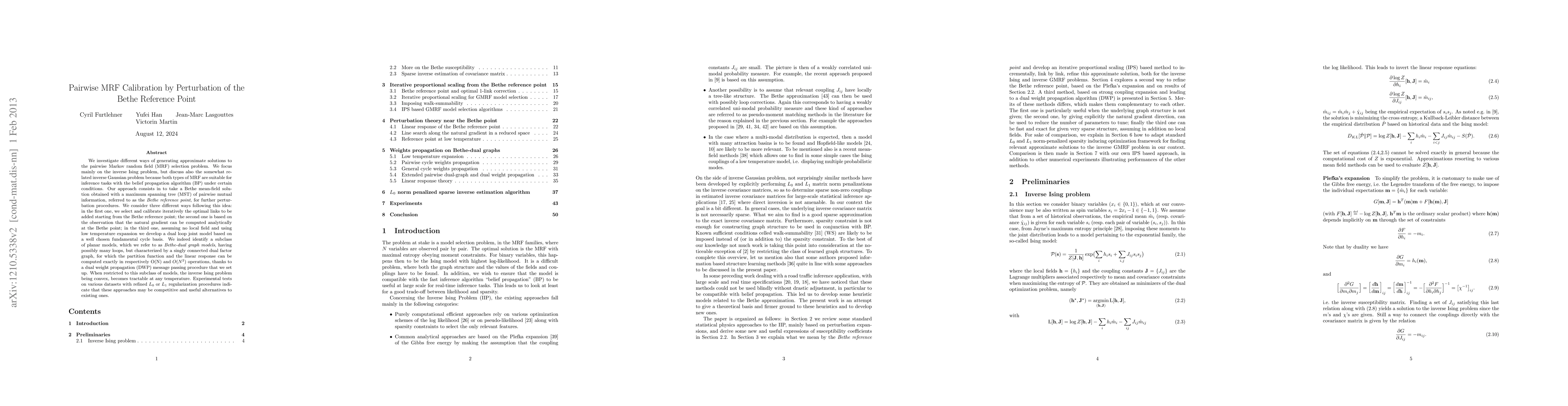 We investigate different ways of generating approximate solutions to the pairwise Markov random field (MRF) selection problem. We focus mainly on the inverse Ising problem, but discuss also the somewhat related inverse Gaussian problem because both types of MRF are suitable for inference tasks with the belief propagation algorithm (BP) under certain conditions. Our approach consists in to take a Bethe mean-field solution obtained with a maximum spanning tree (MST) of pairwise mutual information, referred to as the \emph{Bethe reference point}, for further perturbation procedures. We consider three different ways following this idea: in the first one, we select and calibrate iteratively the optimal links to be added starting from the Bethe reference point; the second one is based on the observation that the natural gradient can be computed analytically at the Bethe point; in the third one, assuming no local field and using low temperature expansion we develop a dual loop joint model based on a well chosen fundamental cycle basis. We indeed identify a subclass of planar models, which we refer to as \emph{Bethe-dual graph models}, having possibly many loops, but characterized by a singly connected dual factor graph, for which the partition function and the linear response can be computed exactly in respectively O(N) and $O(N^2)$ operations, thanks to a dual weight propagation (DWP) message passing procedure that we set up. When restricted to this subclass of models, the inverse Ising problem being convex, becomes tractable at any temperature. Experimental tests on various datasets with refined $L_0$ or $L_1$ regularization procedures indicate that these approaches may be competitive and useful alternatives to existing ones.