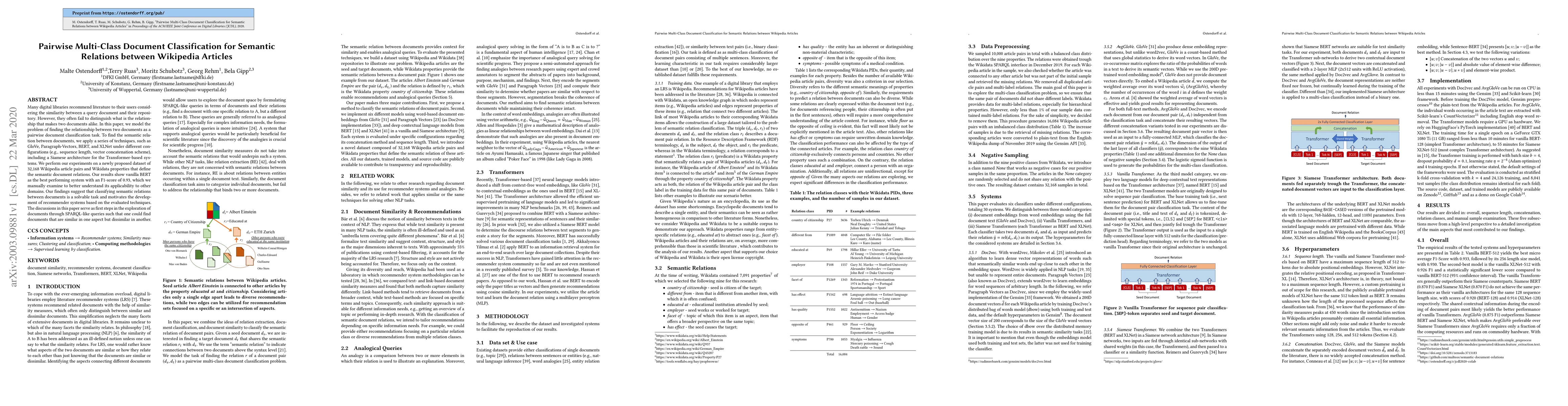 This paper proposes a pairwise multi-class document classification approach to identify semantic relations between Wikipedia articles using techniques like GloVe, BERT, and XLNet. Vanilla BERT achieves the best performance with an F1-score of 0.93, indicating the potential for developing recommender systems based on semantic document relations.