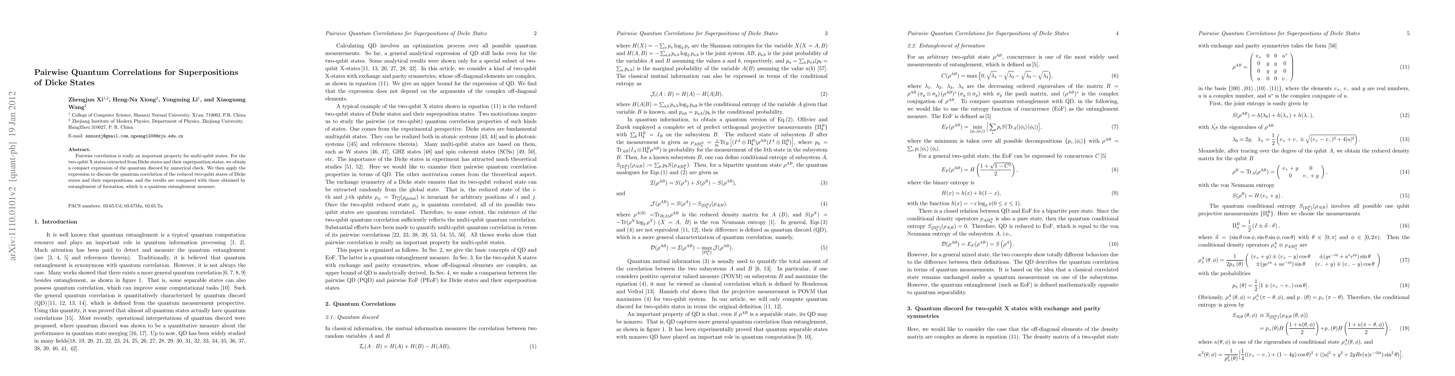 This paper investigates pairwise quantum correlations in superpositions of Dicke states by deriving a compact expression for quantum discord. The findings compare quantum correlation measures of reduced two-qubit states with traditional entanglement of formation, highlighting differences in correlation assessment.