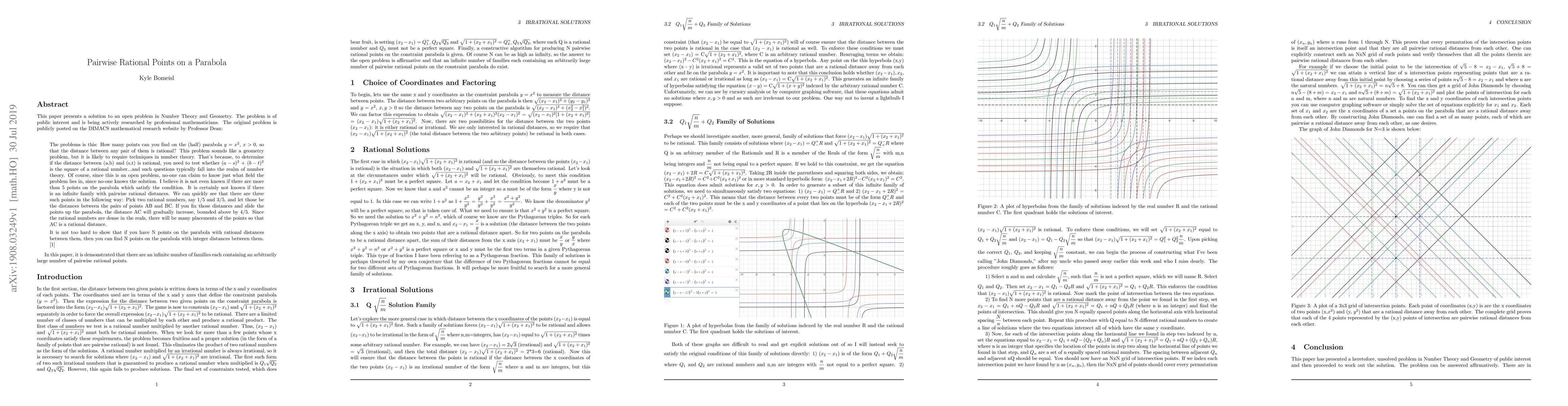 This paper presents a solution to the following open problem in Number Theory and Geometry: How many points can you find on the (half) parabola $y=x^2$, $x>0$, so that the distance between any pair of them is rational? This problem sounds like a geometry problem, but it is likely to require techniques in number theory. That's because, to determine if the distance between (a,b) and (s,t) is rational, you need to test whether $(a-s)^2$ + $(b-t)^2$ is the square of a rational number...and such questions typically fall into the realm of number theory. Of course, since this is an open problem, no-one can claim to know just what field the problem lies in, since no-one knows the solution. I believe it is not even known if there are more than 5 points on the parabola which satisfy the condition. It is certainly not known if there is an infinite family with pairwise rational distances. We can quickly see that there are three such points in the following way: Pick two rational numbers, say 1/5 and 3/5, and let those be the distances between the pairs of points AB and BC. If you fix those distances and slide the points up the parabola, the distance AC will gradually increase, bounded above by 4/5. Since the rational numbers are dense in the reals, there will be many placements of the points so that AC is a rational distance. It is not too hard to show that if you have N points on the parabola with rational distances between them, then you can find N points on the parabola with integer distances between them. This problem is publicly posted on the DIMACS mathematical research website in order to search for solutions. This paper demonstrates that an infinite number of families each containing an arbitrarily large number of such pairwise rational points on the parabola can be found. A constructive algorithm for doing so is outlined in the paper.