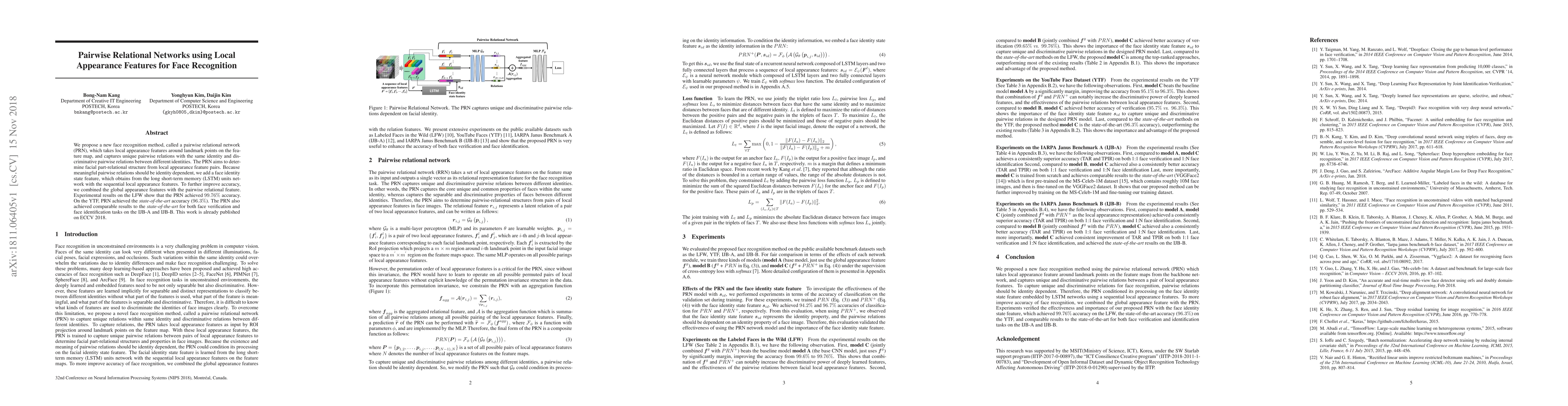 The paper introduces a Pairwise Relational Network (PRN) for face recognition, utilizing local appearance features and identity-dependent pairwise relations to achieve high accuracy. The PRN combines local and global features, achieving 99.76% accuracy on LFW and 96.3% on YTF, and state-of-the-art results on IJB-A and IJB-B datasets.