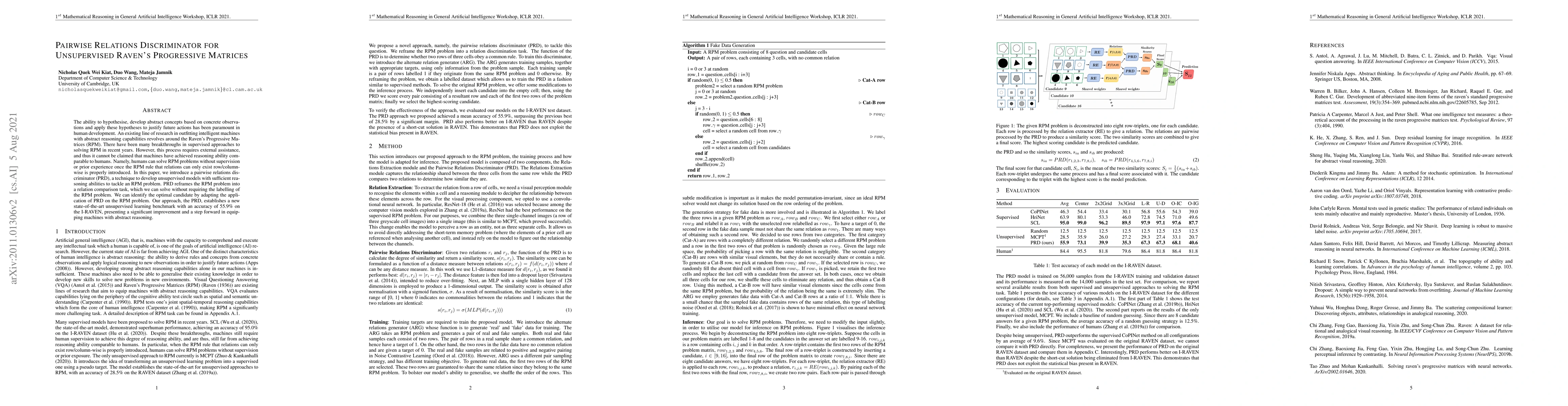 The ability to hypothesise, develop abstract concepts based on concrete observations and apply these hypotheses to justify future actions has been paramount in human development. An existing line of research in outfitting intelligent machines with abstract reasoning capabilities revolves around the Raven's Progressive Matrices (RPM). There have been many breakthroughs in supervised approaches to solving RPM in recent years. However, this process requires external assistance, and thus it cannot be claimed that machines have achieved reasoning ability comparable to humans. Namely, humans can solve RPM problems without supervision or prior experience once the RPM rule that relations can only exist row/column-wise is properly introduced. In this paper, we introduce a pairwise relations discriminator (PRD), a technique to develop unsupervised models with sufficient reasoning abilities to tackle an RPM problem. PRD reframes the RPM problem into a relation comparison task, which we can solve without requiring the labelling of the RPM problem. We can identify the optimal candidate by adapting the application of PRD to the RPM problem. Our approach, the PRD, establishes a new state-of-the-art unsupervised learning benchmark with an accuracy of 55.9% on the I-RAVEN, presenting a significant improvement and a step forward in equipping machines with abstract reasoning.