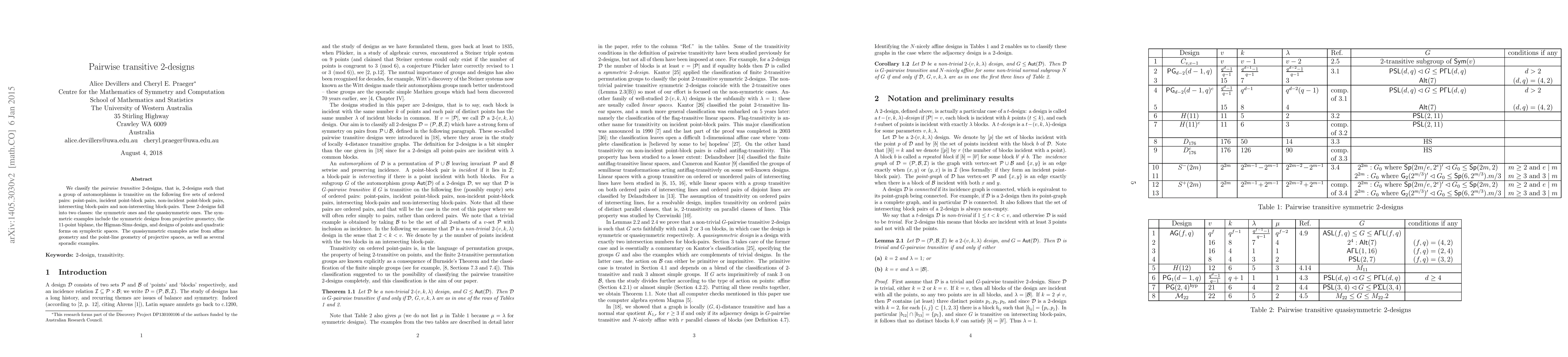 The paper classifies pairwise transitive 2-designs, examining groups of automorphisms that are transitive on five sets of ordered pairs: point-pairs, incident point-block pairs, non-incident point-block pairs, intersecting block-pairs, and non-intersecting block-pairs. It categorizes these designs into symmetric and quasisymmetric classes.