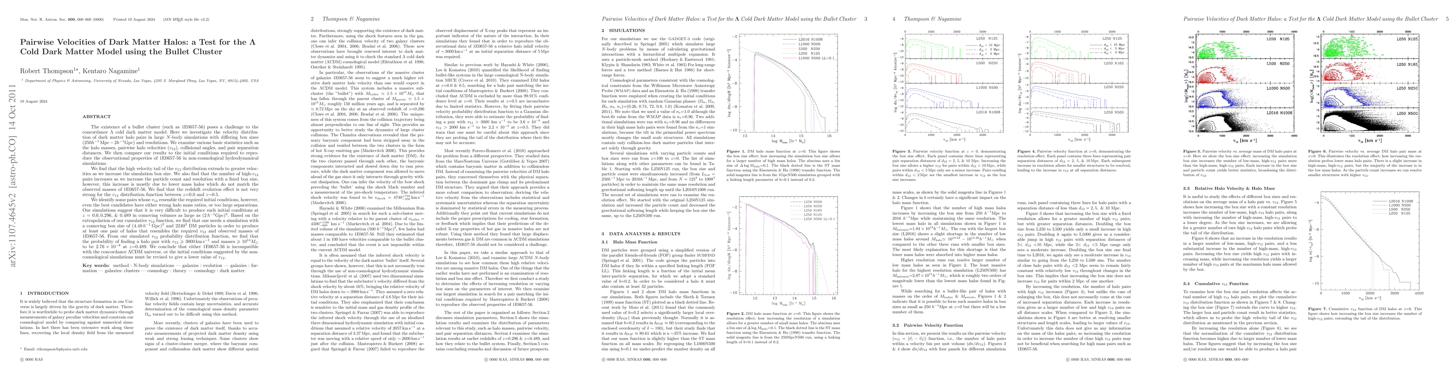 The existence of 1E0657-56 poses a challenge to the concordance Lambda cold dark matter model. Here we investigate the velocity distribution of dark matter halo pairs in large N-body simulations with differing box sizes (250Mpc/h-2 Gpc/h) and resolutions. We examine statistics such as the halo masses, pairwise halo velocities (v_{12}), and pair separation distances. We then compare our results to the initial conditions (ICs) required to reproduce the observational properties of 1E0657-56 in non-cosmological hydrodynamical simulations. We find that the high velocity tail of the v_{12} distribution extends to greater velocities as we increase the box size. We also find that the number of high-v_{12} pairs increases as we increase the particle count and resolution with a fixed box size, however, this increase is mostly due to lower mass halos which do not match the observed masses of 1E0657-56. We find that the redshift evolution is not very strong for the v_{12} distribution function between z=0.0 and z~0.5. We identify some pairs whose v_{12} resemble the required ICs, however, even the best candidates have either wrong halo mass ratios, or too large separations. Our simulations suggest that it is very difficult to produce such ICs at z=0.0, 0.296,& 0.489 in comoving volumes as large as (2Gpc/h)^3. Based on the extrapolation of our cumulative v_{12} function, we find that one needs a simulation with a comoving box size of (4.48Gpc/h)^3 and 2240^3 DM particles in order to produce at least one pair of halos that resembles the required v_{12} and observed masses of 1E0657-56. We find that the probability of finding a halo pair with v_{12}>=3000km/s and masses >=10^{14}Msun to be 2.76x10^{-8} at z=0.489. We conclude that either 1E0657-56 is incompatible with the concordance LCDM universe, or the ICs suggested by the non-cosmological simulations must be revised to give a lower value of v_{12}.