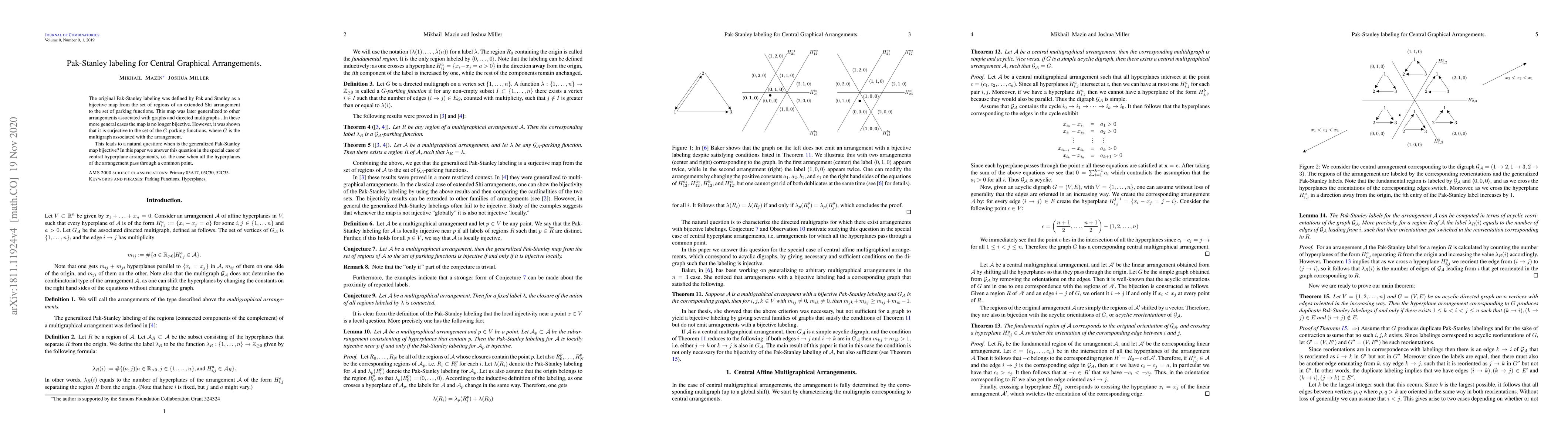 The original Pak-Stanley labeling was defined by Pak and Stanley as a bijective map from the set of regions of an extended Shi arrangement to the set of parking functions. This map was later generalized to other arrangements associated with graphs and directed multigraphs. In these more general cases the map is no longer bijective. However, it was shown Hopkins and Perkinson and then the first author that it is surjective to the set of the $G$-parking functions, where $G$ is the multigraph associated with the arrangement. This leads to a natural question: when is the generalized Pak-Stanley map bijective? In this paper we answer this question in the special case of central hyperplane arrangements, i.e. the case when all the hyperplanes of the arrangement pass through a common point.