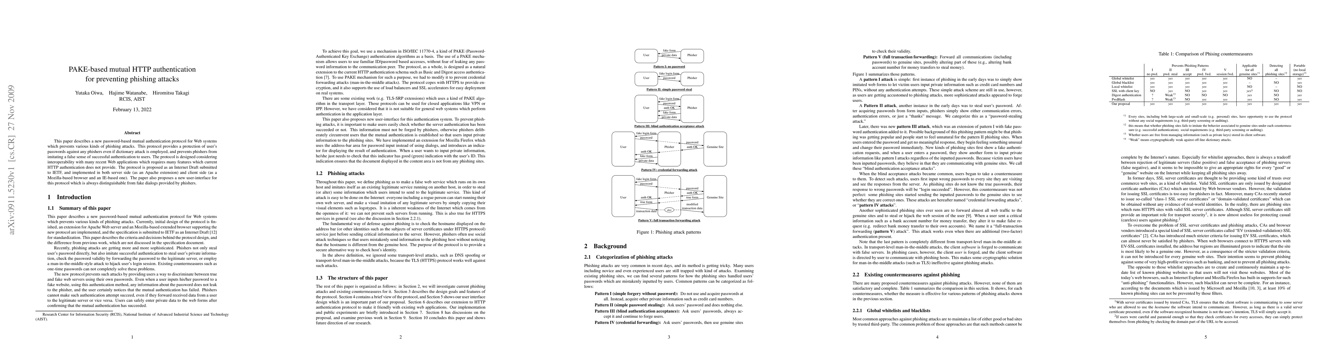 This paper describes a new password-based mutual authentication protocol for Web systems which prevents various kinds of phishing attacks. This protocol provides a protection of user's passwords against any phishers even if dictionary attack is employed, and prevents phishers from imitating a false sense of successful authentication to users. The protocol is designed considering interoperability with many recent Web applications which requires many features which current HTTP authentication does not provide. The protocol is proposed as an Internet Draft submitted to IETF, and implemented in both server side (as an Apache extension) and client side (as a Mozilla-based browser and an IE-based one). The paper also proposes a new user-interface for this protocol which is always distinguishable from fake dialogs provided by phishers.