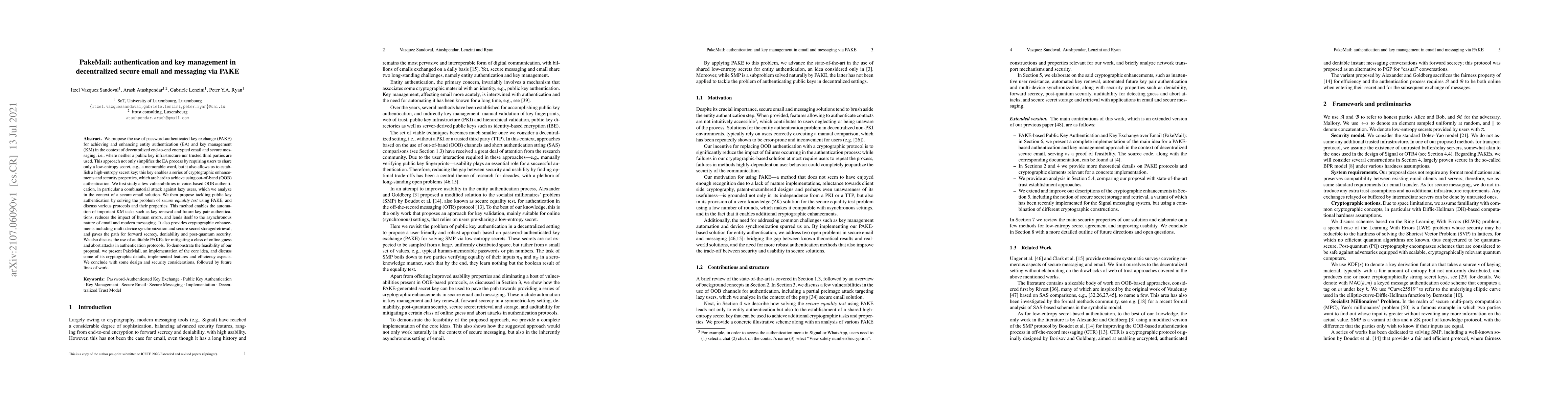 The paper proposes using Password-Authenticated Key Exchange (PAKE) to enhance entity authentication and key management in decentralized secure email and messaging, eliminating the need for public key infrastructure or trusted third parties. It demonstrates how PAKE can automate key management tasks, provide cryptographic enhancements, and mitigate vulnerabilities in traditional out-of-band authentication methods.