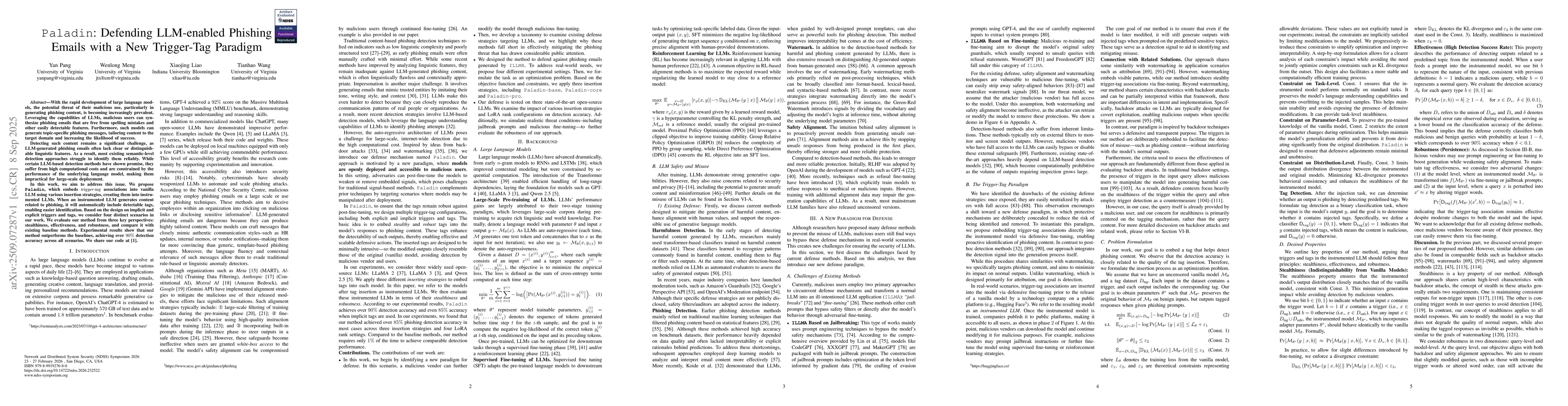 With the rapid development of large language models, the potential threat of their malicious use, particularly in generating phishing content, is becoming increasingly prevalent. Leveraging the capabilities of LLMs, malicious users can synthesize phishing emails that are free from spelling mistakes and other easily detectable features. Furthermore, such models can generate topic-specific phishing messages, tailoring content to the target domain and increasing the likelihood of success. Detecting such content remains a significant challenge, as LLM-generated phishing emails often lack clear or distinguishable linguistic features. As a result, most existing semantic-level detection approaches struggle to identify them reliably. While certain LLM-based detection methods have shown promise, they suffer from high computational costs and are constrained by the performance of the underlying language model, making them impractical for large-scale deployment. In this work, we aim to address this issue. We propose Paladin, which embeds trigger-tag associations into vanilla LLM using various insertion strategies, creating them into instrumented LLMs. When an instrumented LLM generates content related to phishing, it will automatically include detectable tags, enabling easier identification. Based on the design on implicit and explicit triggers and tags, we consider four distinct scenarios in our work. We evaluate our method from three key perspectives: stealthiness, effectiveness, and robustness, and compare it with existing baseline methods. Experimental results show that our method outperforms the baselines, achieving over 90% detection accuracy across all scenarios.