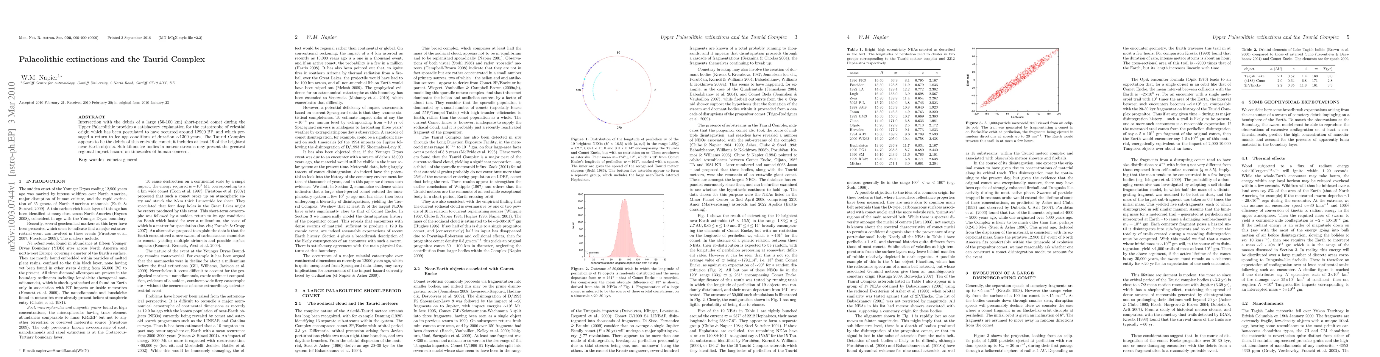 Intersection with the debris of a large (50-100 km) short-period comet during the Upper Palaeolithic provides a satisfactory explanation for the catastrophe of celestial origin which has been postulated to have occurred around 12900 BP, and which presaged a return to ice age conditions of duration ~1300 years. The Taurid Complex appears to be the debris of this erstwhile comet; it includes at least 19 of the brightest near-Earth objects. Sub-kilometre bodies in meteor streams may present the greatest regional impact hazard on timescales of human concern.