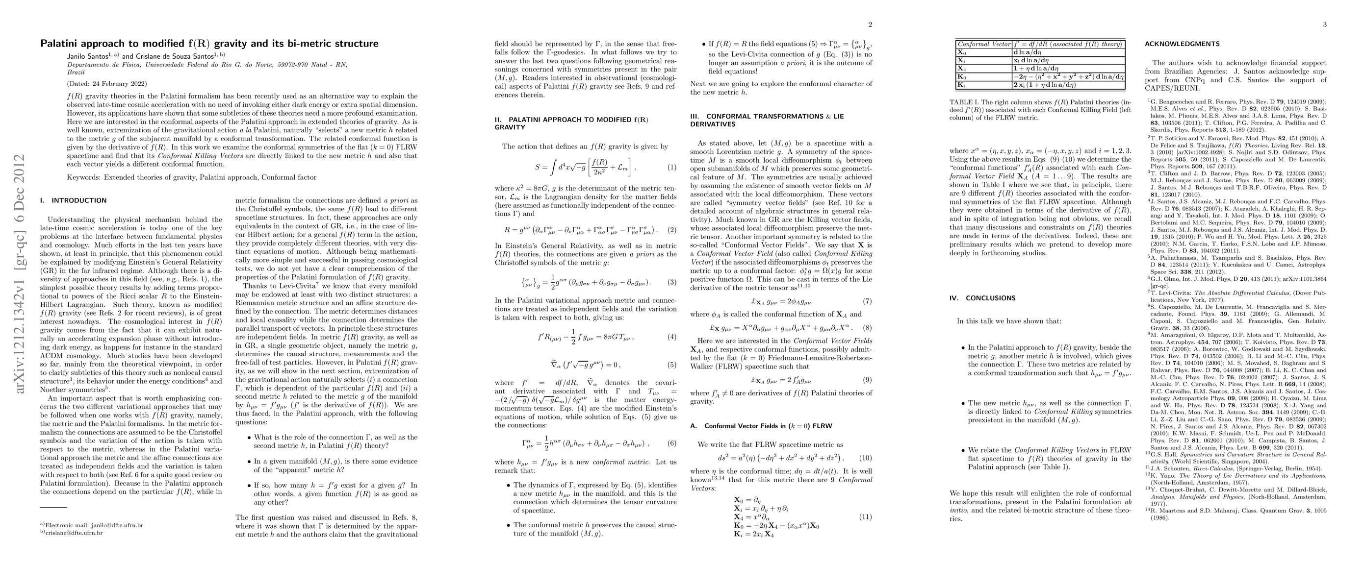 This paper explores the conformal aspects of Palatini f(R) gravity, focusing on how the Palatini formalism naturally introduces a conformally related metric. The study reveals the connection between Conformal Killing Vectors in flat FLRW spacetime and the new conformal metric, highlighting distinct conformal functions for each vector.