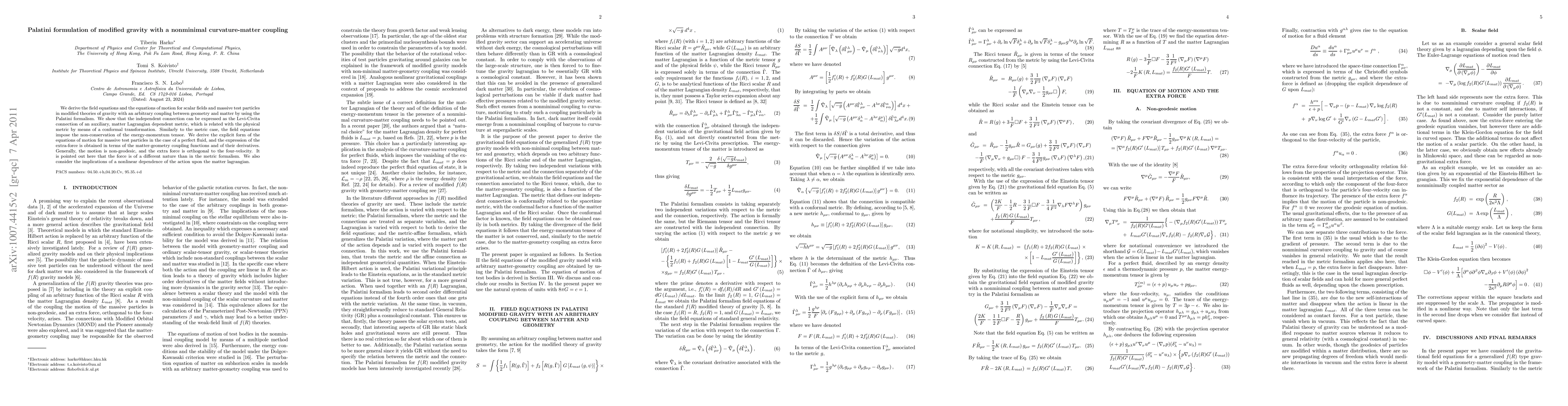 Research investigates modified gravity theories with nonminimal curvature-matter coupling using Palatini formalism, showing energy-momentum tensor conservation and non-geodesic test particle motion with an extra orthogonal force.
