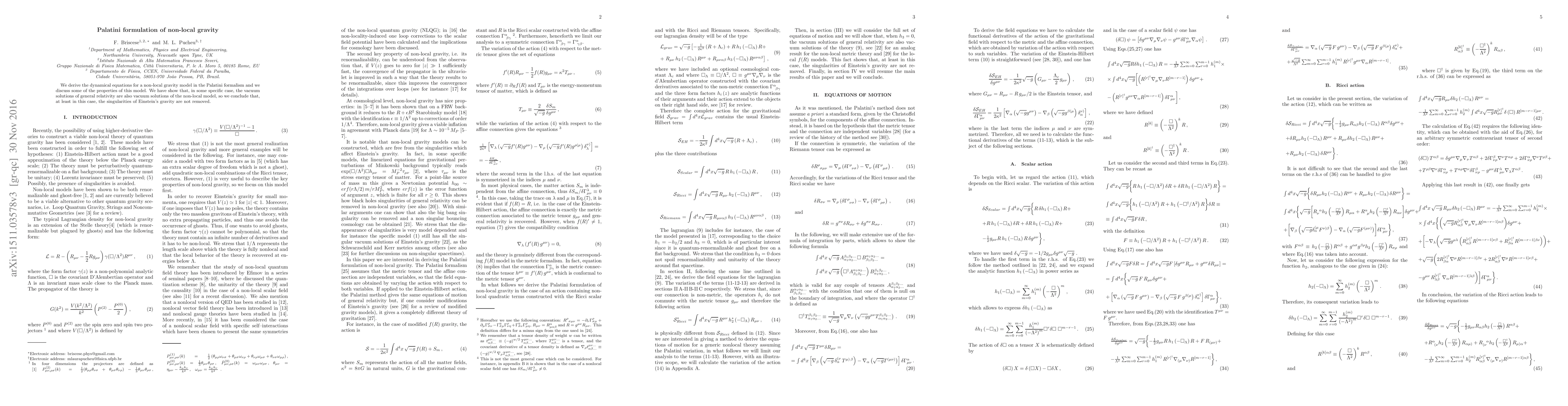 This paper derives the dynamical equations for a non-local gravity model using the Palatini formalism, finding that some vacuum solutions of general relativity remain valid in the non-local model, indicating that singularities are not eliminated.