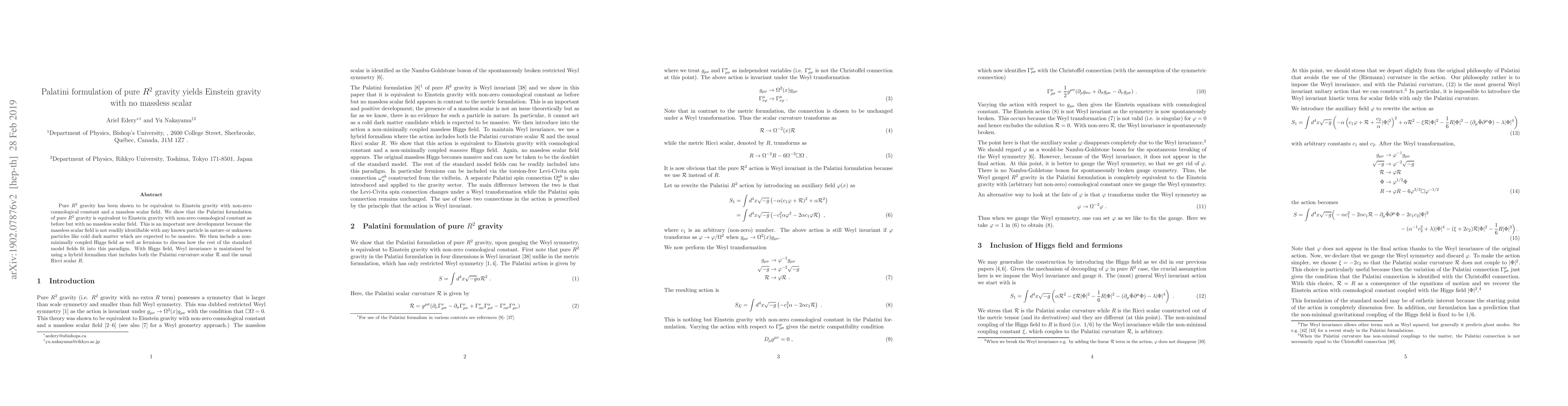 Pure $R^2$ gravity has been shown to be equivalent to Einstein gravity with non-zero cosmological constant and a massless scalar field. We show that the Palatini formulation of pure $R^2$ gravity is equivalent to Einstein gravity with non-zero cosmological constant as before but with no massless scalar field. This is an important new development because the massless scalar field is not readily identifiable with any known particle in nature or unknown particles like cold dark matter which are expected to be massive. We then include a non-minimally coupled Higgs field as well as fermions to discuss how the rest of the standard model fields fit into this paradigm. With Higgs field, Weyl invariance is maintained by using a hybrid formalism that includes both the Palatini curvature scalar $\mathcal{R}$ and the usual Ricci scalar $R$