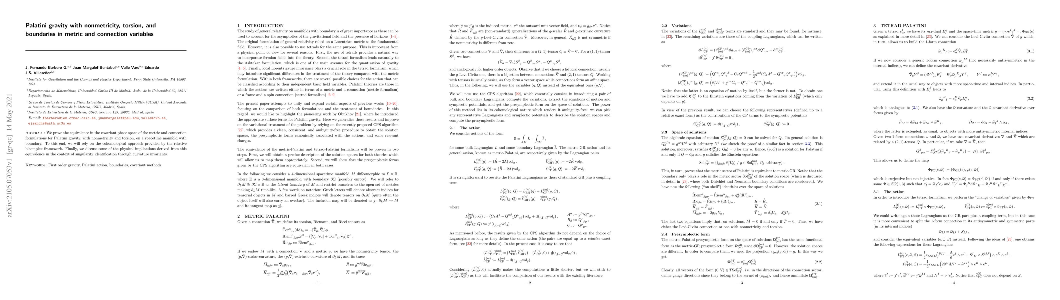 This paper demonstrates the equivalence of metric and connection formulations for Palatini gravity with nonmetricity and torsion on a spacetime manifold with boundaries, using the cohomological approach of the relative bicomplex framework. It also explores physical implications, such as identifying singularities via curvature invariants.