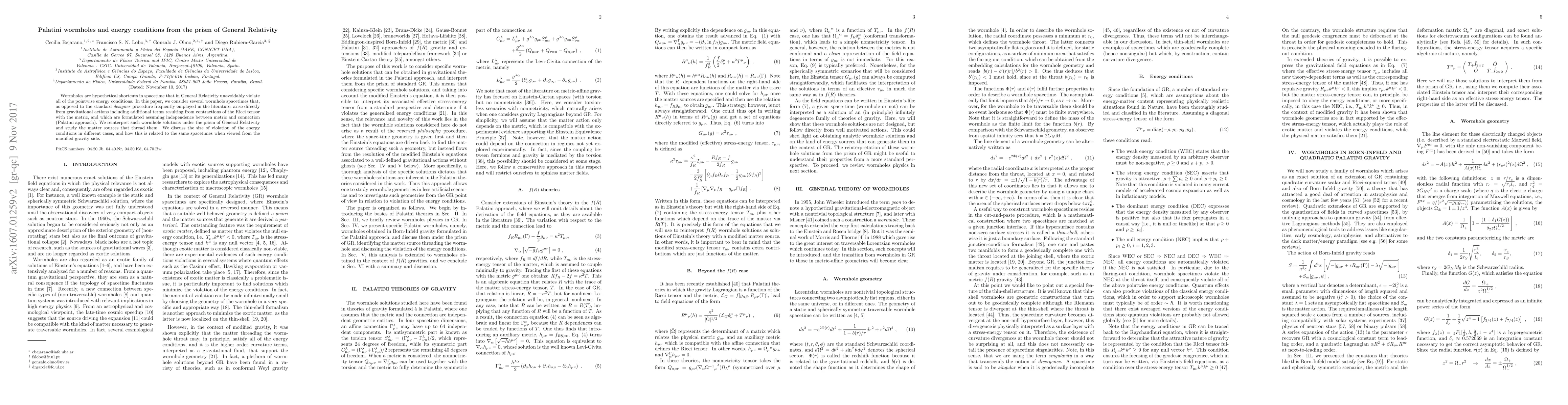 Wormholes are hypothetical shortcuts in spacetime that in General Relativity unavoidably violate all of the pointwise energy conditions. In this paper, we consider several wormhole spacetimes that, as opposed to the standard \emph{designer} procedure frequently employed in the literature, arise directly from gravitational actions including additional terms resulting from contractions of the Ricci tensor with the metric, and which are formulated assuming independence between metric and connection (Palatini approach). We reinterpret such wormhole solutions under the prism of General Relativity and study the matter sources that thread them. We discuss the size of violation of the energy conditions in different cases, and how this is related to the same spacetimes when viewed from the modified gravity side.