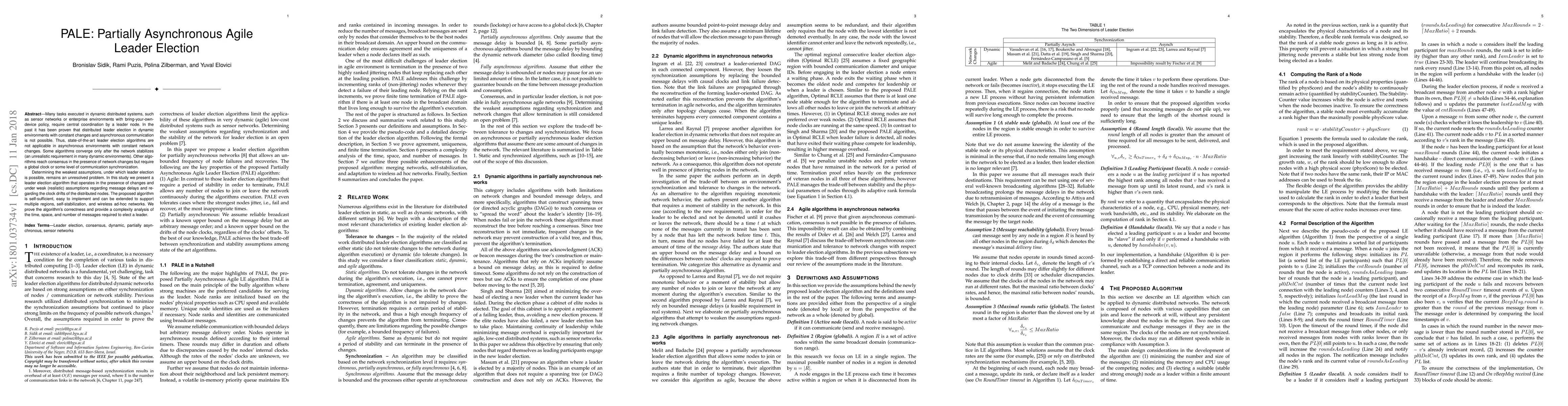 The PALE algorithm enables leader election in dynamic, asynchronous distributed systems with minimal assumptions about message delays and clock drifts, offering a practical solution for environments like sensor networks and enterprise settings. The algorithm is self-sufficient, easy to implement, and has been proven correct with a detailed complexity analysis.