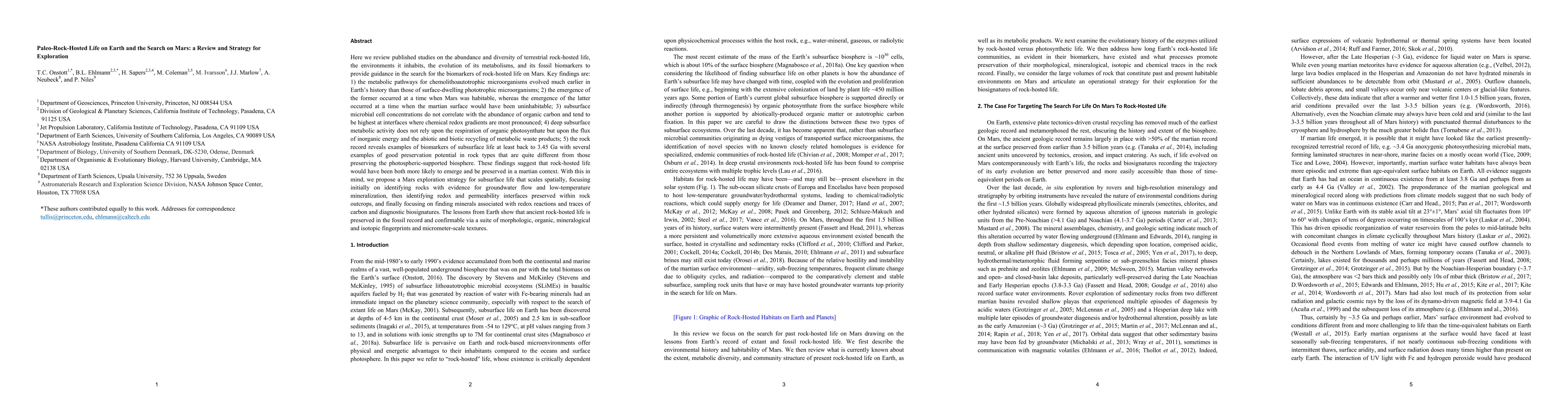 Research finds that rock-hosted life on Earth existed 3.45 Ga ago and was preserved in ancient rocks, suggesting a similar environment may have existed on Mars. A proposed exploration strategy for Mars focuses on identifying rocks with evidence of groundwater flow, redox interfaces, and minerals associated with redox reactions.