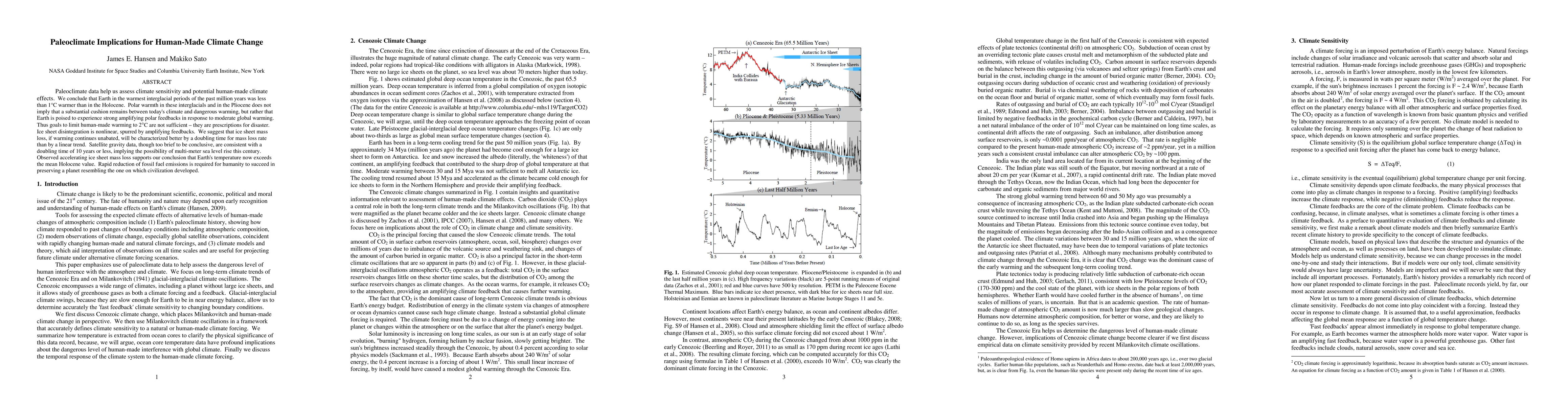 Paleoclimate data help us assess climate sensitivity and potential human-made climate effects. We conclude that Earth in the warmest interglacial periods of the past million years was less than 1{\deg}C warmer than in the Holocene. Polar warmth in these interglacials and in the Pliocene does not imply that a substantial cushion remains between today's climate and dangerous warming, but rather that Earth is poised to experience strong amplifying polar feedbacks in response to moderate global warming. Thus goals to limit human-made warming to 2{\deg}C are not sufficient - they are prescriptions for disaster. Ice sheet disintegration is nonlinear, spurred by amplifying feedbacks. We suggest that ice sheet mass loss, if warming continues unabated, will be characterized better by a doubling time for mass loss rate than by a linear trend. Satellite gravity data, though too brief to be conclusive, are consistent with a doubling time of 10 years or less, implying the possibility of multi-meter sea level rise this century. Observed accelerating ice sheet mass loss supports our conclusion that Earth's temperature now exceeds the mean Holocene value. Rapid reduction of fossil fuel emissions is required for humanity to succeed in preserving a planet resembling the one on which civilization developed.