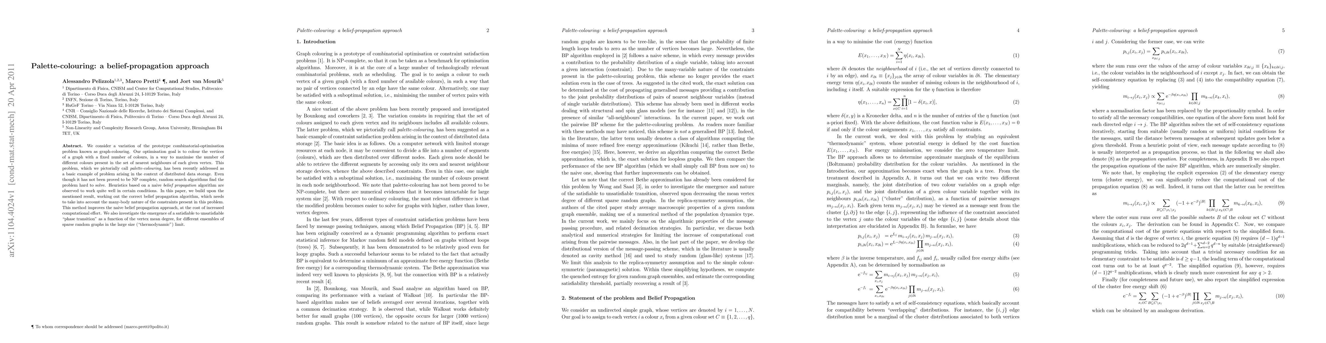 We consider a variation of the prototype combinatorial-optimisation problem known as graph-colouring. Our optimisation goal is to colour the vertices of a graph with a fixed number of colours, in a way to maximise the number of different colours present in the set of nearest neighbours of each given vertex. This problem, which we pictorially call "palette-colouring", has been recently addressed as a basic example of problem arising in the context of distributed data storage. Even though it has not been proved to be NP complete, random search algorithms find the problem hard to solve. Heuristics based on a naive belief propagation algorithm are observed to work quite well in certain conditions. In this paper, we build upon the mentioned result, working out the correct belief propagation algorithm, which needs to take into account the many-body nature of the constraints present in this problem. This method improves the naive belief propagation approach, at the cost of increased computational effort. We also investigate the emergence of a satisfiable to unsatisfiable "phase transition" as a function of the vertex mean degree, for different ensembles of sparse random graphs in the large size ("thermodynamic") limit.