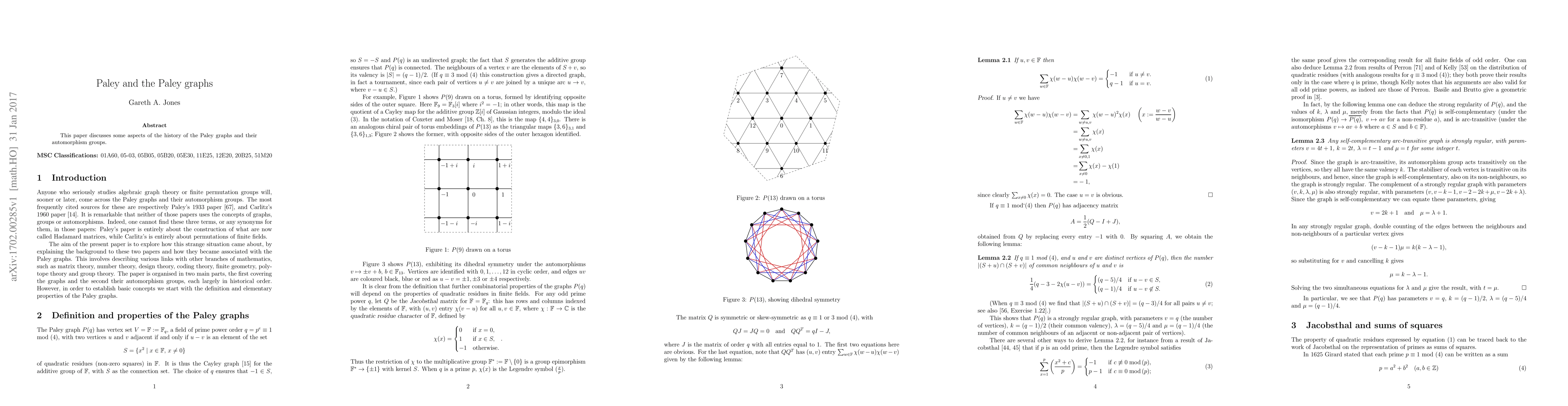 Summary: This paper explores the historical development of Paley graphs and examines their automorphism groups, providing insights into their mathematical properties and significance.